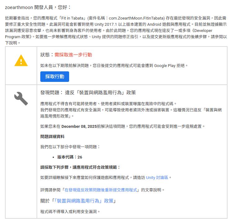 近期審查指出,您的應用程式「Fit in Tabata」(套件名稱:com.ZoearthMoon.FitinTabata) 存在最近發現的安全漏洞,因此需要修正重大安全性問題。此漏洞可能會影響到使用 Unity 2017.1 以上版本建置的 Android 遊戲與應用程式。目前並無證據顯示該漏洞遭受惡意攻擊,也尚未影響到身為客戶的使用者。由於此問題,您的應用程式現在違反了一或多項《Developer Program 政策》。如要進一步瞭解應用程式狀態、Unity 提供的問題修正指引,以及提交更新版應用程式的後續步驟,請參閱以下說明。