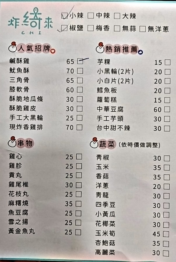 [菜單MENU] 炸綺來鹽酥雞 - 張文綺 藝人名店 鹹酥雞 甜不辣 鱈魚版 SOGO 台中 德國香腸 日期:2022/06/16 大家好 我來分享菜單了 店名: 炸綺來鹽酥雞 地址: 403台中市西區長春街28號電話: 04 2326 0008 給大家參考囉 菜單關鍵字: 炸綺來鹽酥雞 張文綺 藝人名店 鹹酥雞 甜不辣 鱈魚版 SOGO 台中 德國香腸 山藥捲 皮蛋 蝦捲 小銀絲卷 芋泥酥 2022年06月15日: 剛開幕人很多~一次都要等一個小時以上... 其實藝人開店也算是一種名氣變現的方式 所以累積名氣也是很重要的賺錢手段 說到張文綺 就想到 "天才衝衝衝" 我老媽超愛看的~