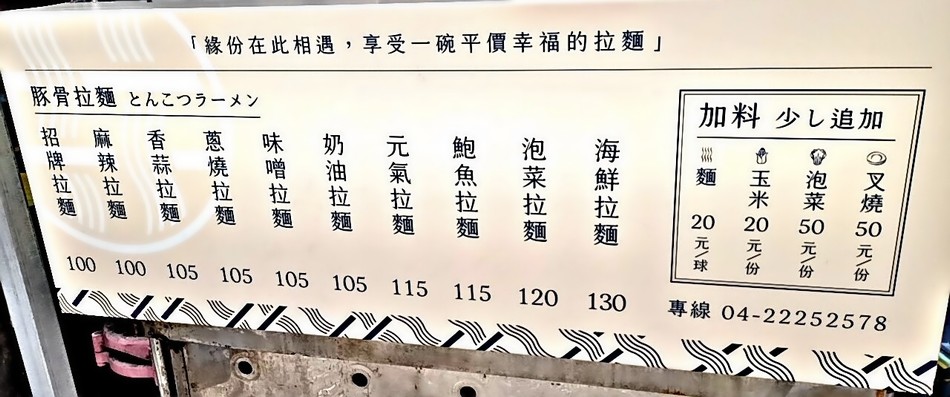 菜單關鍵字: 緣井豚骨拉麵 台中 一中街 拉麵 平價 CP值 奶味 招牌 麻辣 香蒜 蔥燒 味噌 鮑魚 海鮮
