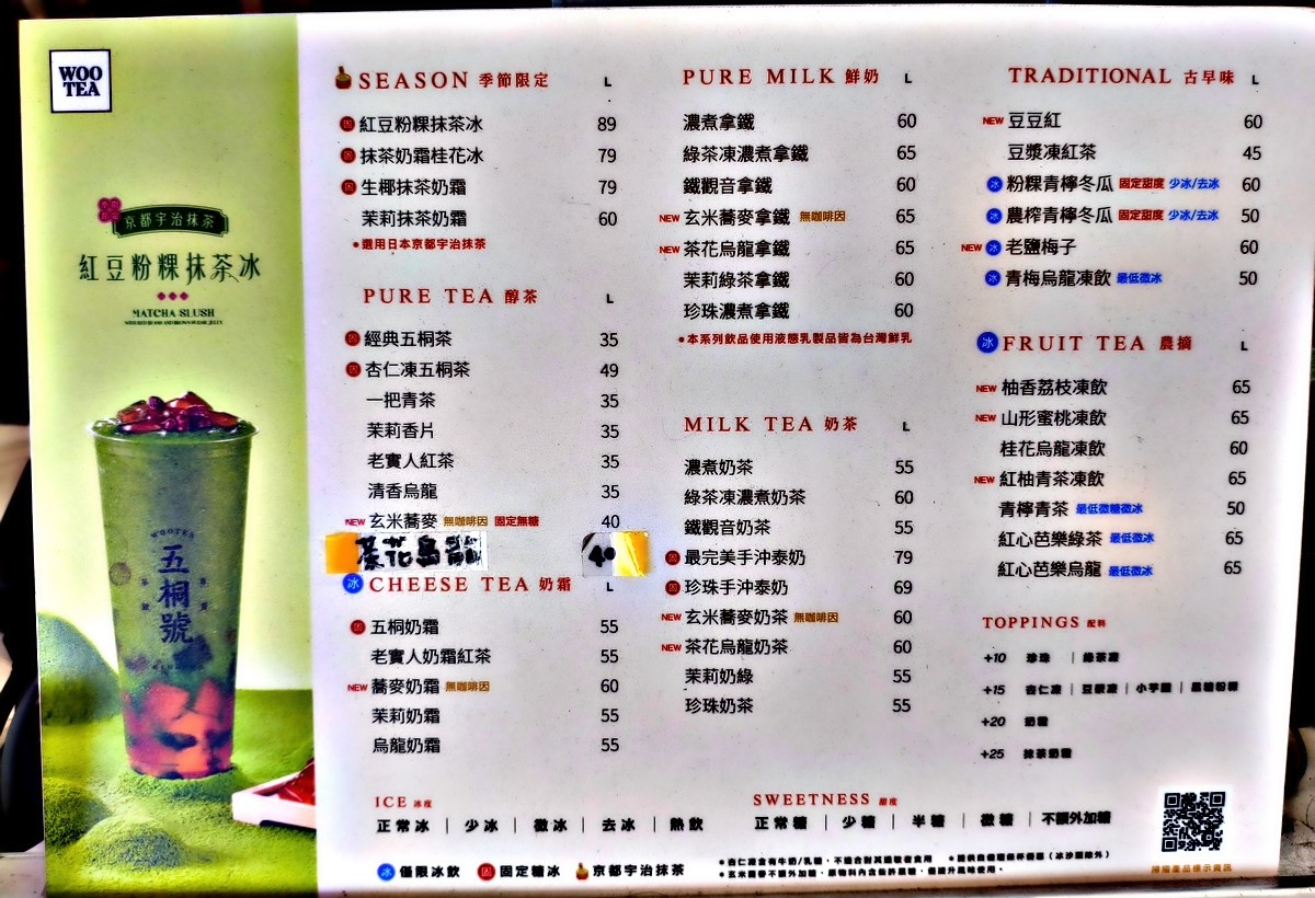 菜單關鍵字: WooTea五桐號 價格 台中 奶霜 水果 泰式奶茶 拿鐵 絲襪奶茶 凍飲 多多 荔枝 奶霜 草莓
