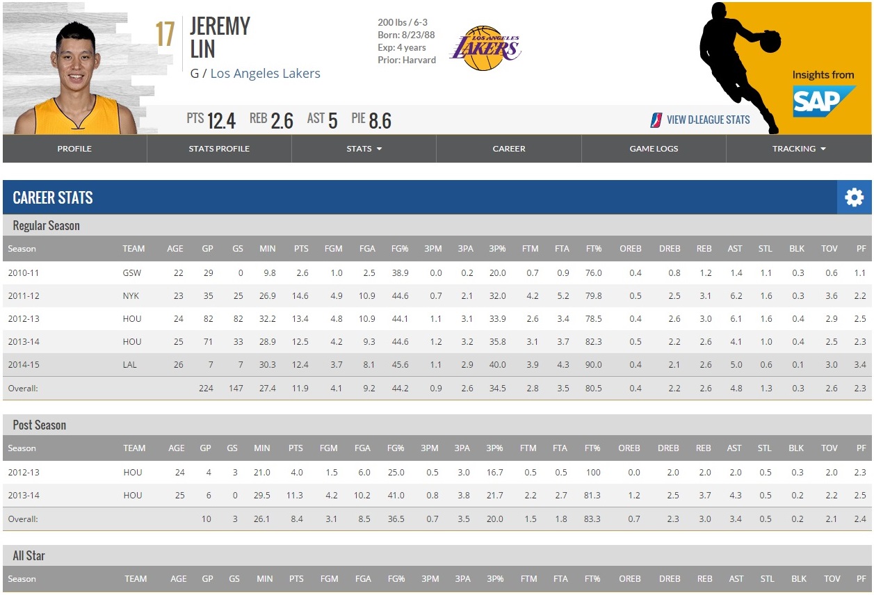 林書豪目前先發7場的平均數據:12.4分5助攻 平均上場時間也來到了30分鐘