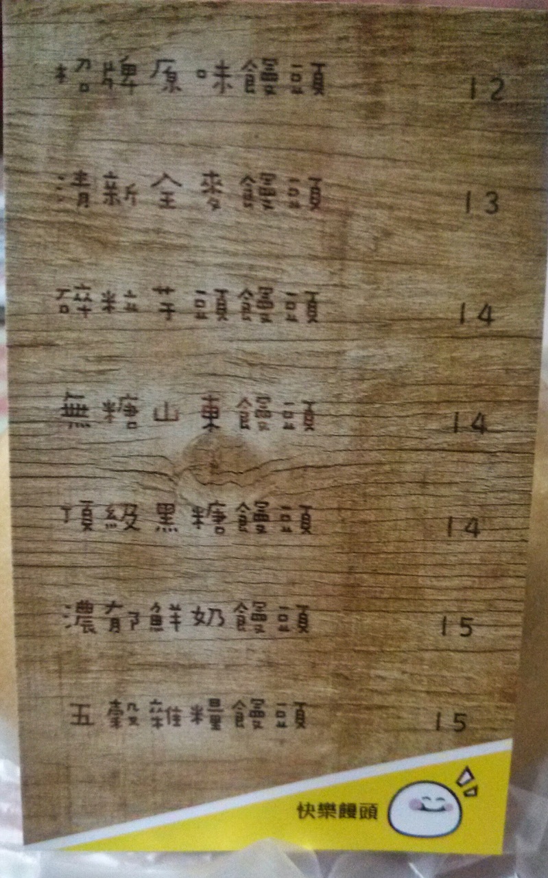 [菜單][MENU][台中]微笑饅頭 快樂饅頭 日期:2014/12/10 大家好 我又來分享菜單了 這次是饅頭人最愛的 [微笑饅頭] 我照片拍得不夠好 所以我就直接打出菜單 原味招牌饅頭 12 元 清新全麥饅頭 13 元 碎粒芋頭饅頭 14 元 無糖山東饅頭 14 元 頂級黑糖饅頭 14 元 濃郁鮮奶饅頭 15 元 五穀雜糧饅頭 15 元 給大家參考 至於說好不好吃 我覺得還不錯啦 感恩!