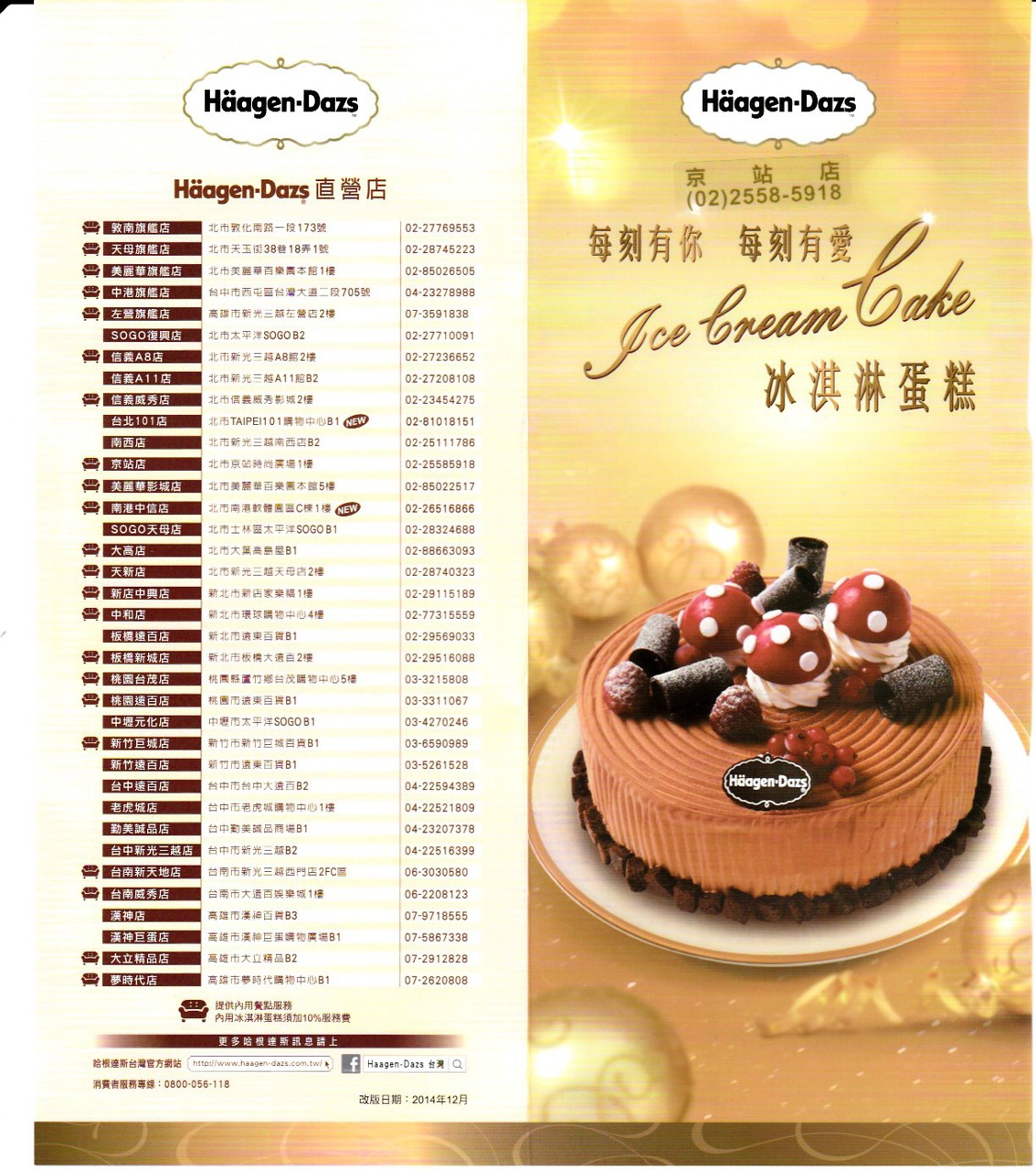 [台北][菜單][MENU][蛋糕]哈根達斯 Haagen-Dazs 蛋糕(2015年03月01日) 日期:2015/03/01 大家好 我又來分享菜單了 店名: 哈根達斯 Haagen-Dazs 京站店地址:台北市京站時尚廣場1樓電話:02-25585918 這好像是蛋糕的MENU 不過我確實還沒吃過哈根達斯! 也許有 但可能也忘記了