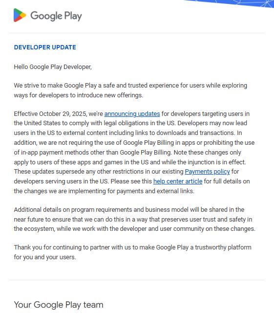 自 2025 年 10 月 29 日起,我們將對面向美國用戶的開發者進行更新,以符合美國的法律義務。開發者現在可以引導美國用戶存取外部內容,包括下載和交易連結。此外,我們不再強制要求應用程式使用 Google Play 結算,也不再禁止使用 Google Play 結算以外的其他應用程式內支付方式。請注意,這些變更僅適用於美國用戶,且僅在禁令生效期間有效。這些更新將取代我們現有支付政策中針對服務美國用戶的開發者的任何其他限制。有關我們針對支付和外部連結實施的變更的完整詳情,請參閱此幫助中心文章。