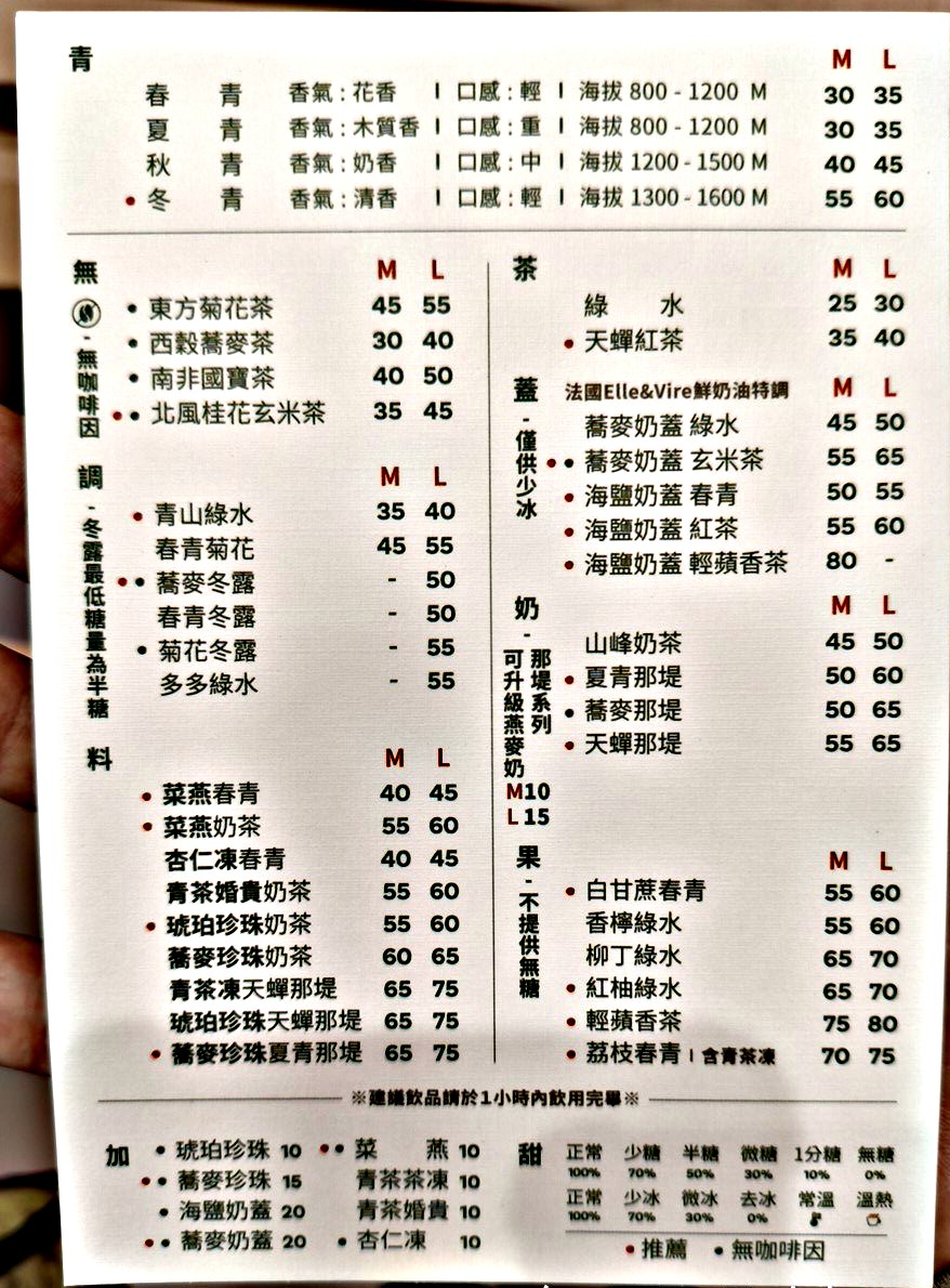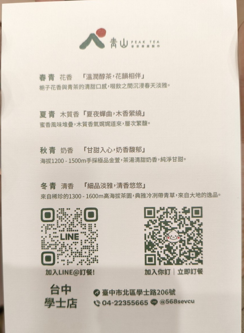 [菜單MENU] 青山 PeakTea - 台中 價格 青茶 玄米茶 珍珠奶茶 日期:2025/11/06 大家好 我來分享菜單了 店名: 青山 PeakTea 給大家參考囉 菜單關鍵字: 青山 青茶 專業製作 青茶 海拔茶 菜燕 綠水 青山 PeakTea 台中 價格 青茶 玄米茶 珍珠奶茶 台中學士店 2025年10月17日: 地址: 404臺中市北區學士路206號電話: 0422355665 現在飲料店競爭真激烈每個品牌都要想辦法做出差異化