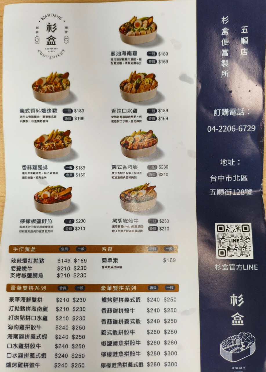 [菜單MENU] 杉盒便當製所 - 台中 便當 價格 口水雞 海南雞 雞排 骰子牛 日期:2025/11/06 大家好 我來分享菜單了 店名: 杉盒便當製所 給大家參考囉 菜單關鍵字: 杉盒便當製所 台中 便當 價格 口水雞 海南雞 雞排 骰子牛 打拋諸 蝦子料理 簡單素食 台中五順店 2025年10月23日: 地址: 臺中市北區五順街128號電話: 0422066729 算是中高價位吧 可能現在便當都是這個價格囉~