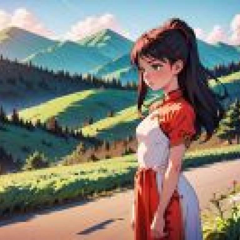 A Woman in a Red Dress Standing on a Road in Front of a Mountain Range with Trees and Flowers Artgerm rossdraws Global Illumination a Painting Cloisonnism