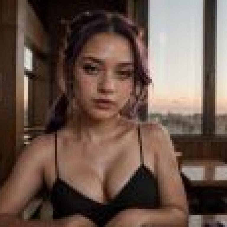 a woman in a bikini sitting at a table with a glass of wine in front of her and a view of the city, Elina Karimova, eye contact, a character portrait, private press