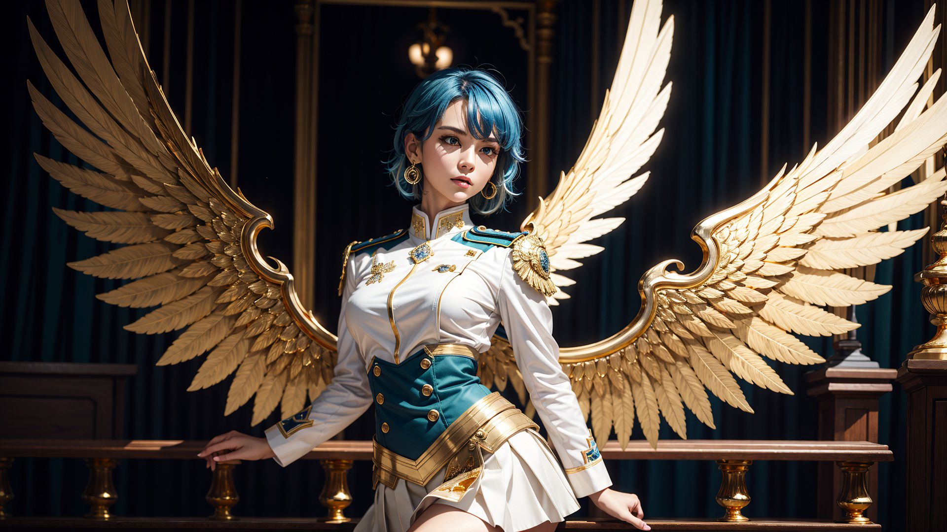 a woman dressed in a costume with wings on her head and a sword in her hand, standing on a balcony, Artgerm, cosplay, a character portrait, fantasy art