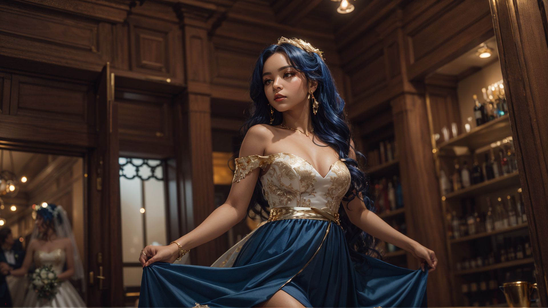 a woman in a blue dress is standing in a room with a book shelf and a mirror behind her, Du Qiong, cosplay, a statue, rococo