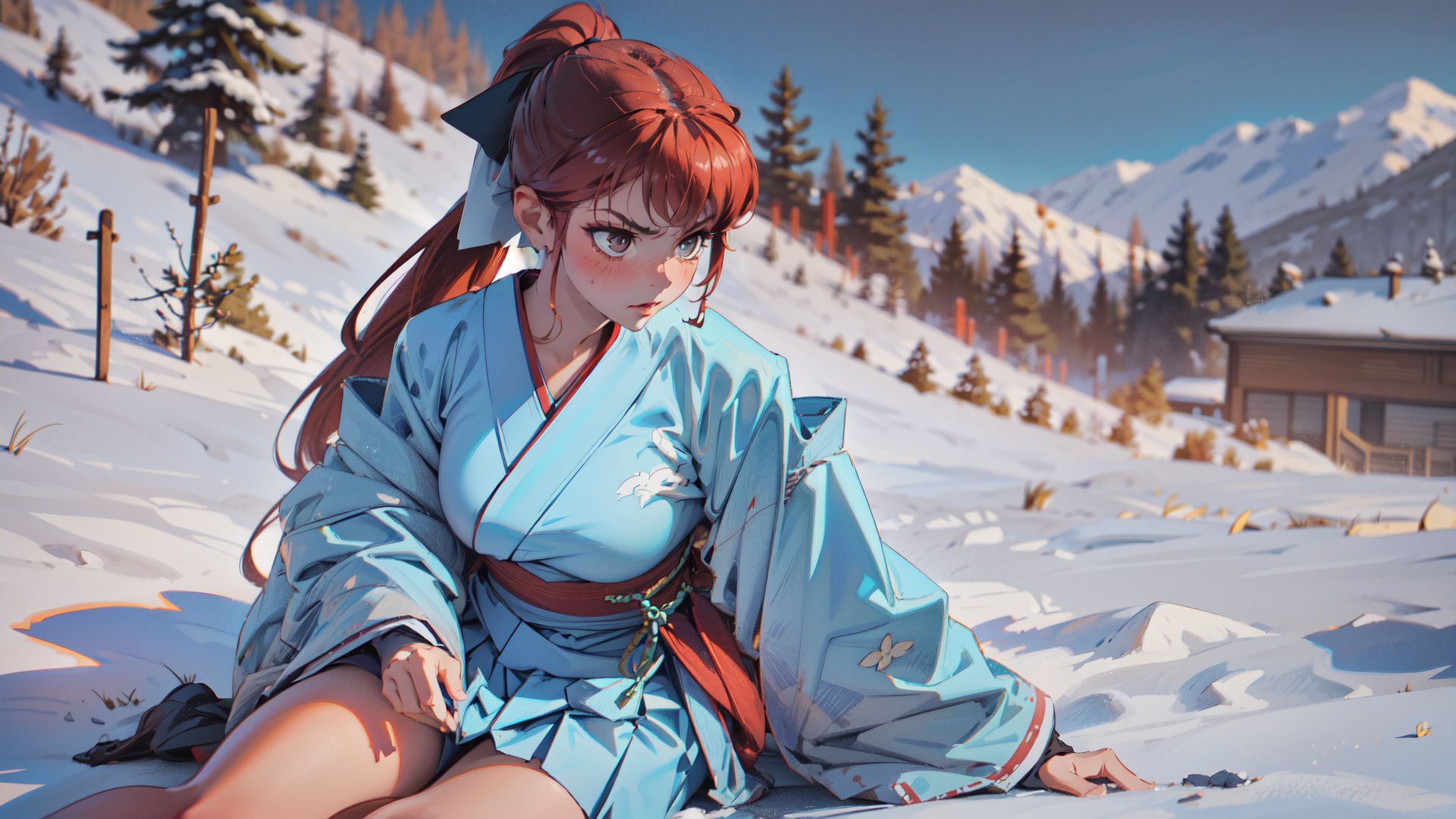 Anime beautiful girl figure, ice and snow fairyland: free download of tablecloths, beautiful girl wearing kimono sitting in the snow, Artgerm anime painting.