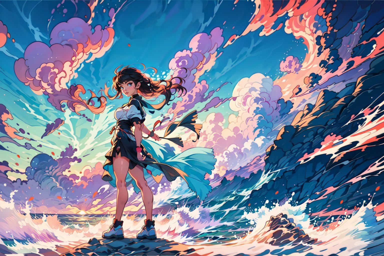 Anime beautiful girl, a girl stands on a sword, holding a sword in her hand, the sky background and Wuyun and Bird, Silil Ron Dost, anime art, detailed painting, fantasy art art