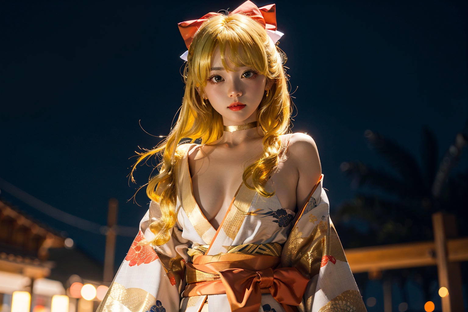 Live version, beautiful girl warrior, sailor Venus, Ai Nakano, beautiful tablecloth, anime tablecloth, a long blonde woman wearing kimono and head bow, standing on the street at night, Fei Danxu, Sakimi Chan, character portrait, dau- al -Stet