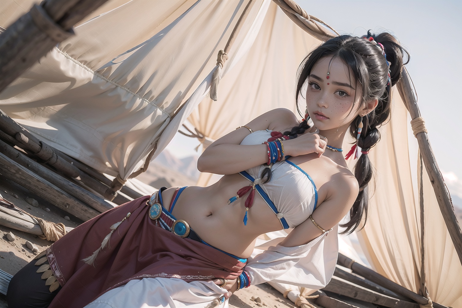 Sexy and peaceful girl, a beautiful girl, a woman wearing bikini and skirts on the beach poses with tents in the background, DU QING, COSPLAY, Computer Graphics, DAU-AL-SET