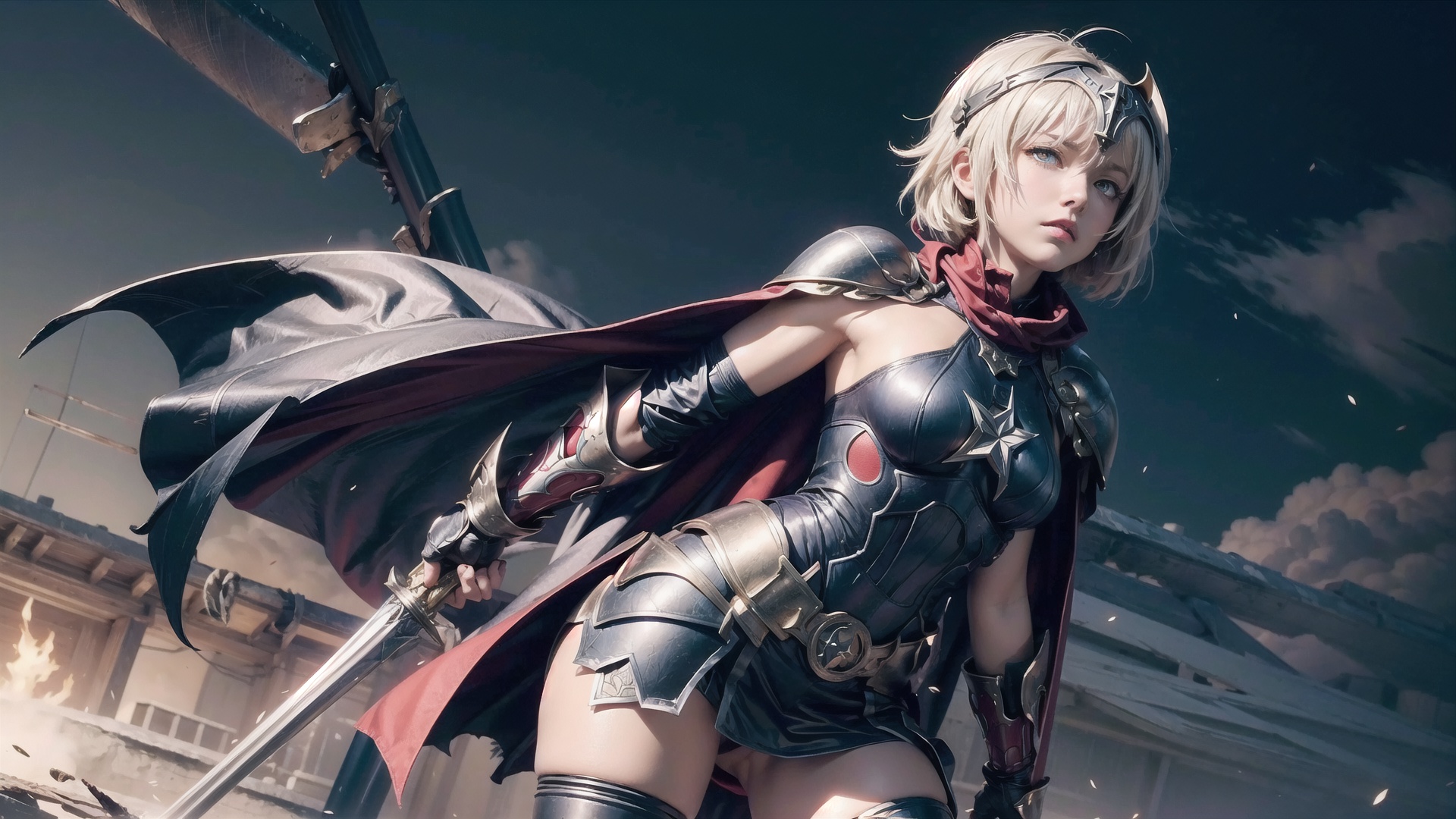 Live anime, Fate, Jeanne, a woman wearing swords and shoulders, standing on the shoulders, standing in front of the building, Andor Basch, Stanley Artgerm Lau
