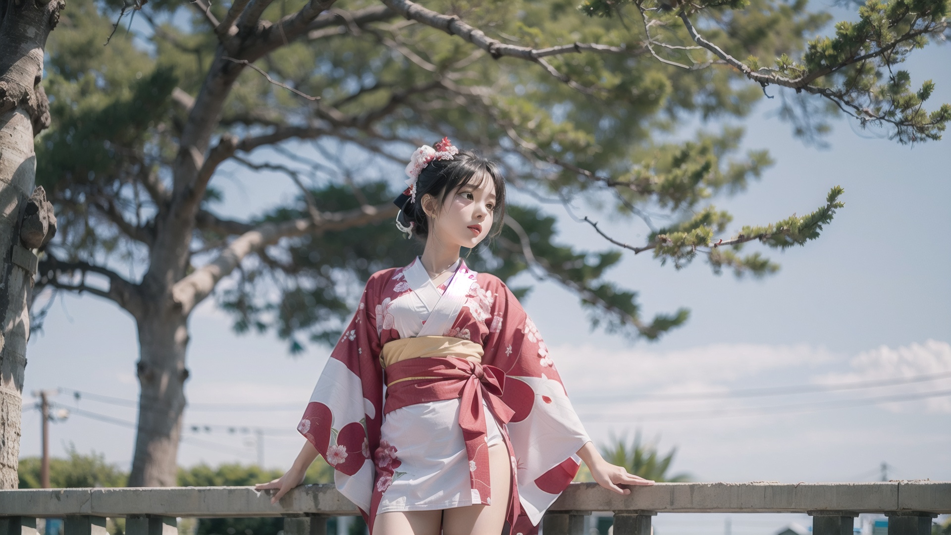 Kimono, photo beauty, 1 girl, naked trees, dark hair, blur, branch, day, depth, flower printing, forest, hair, hair, Japanese clothes, kimono, long sleeves, natural, natural, obI, obi OBI, outdoor, belt, short skirt, kimono, snow, solo, standing, tree, winter, wisteria