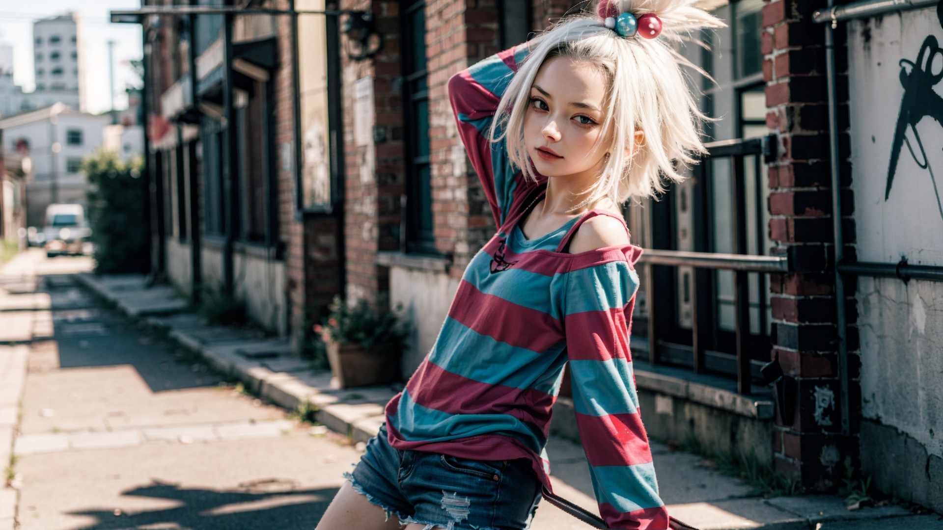 computer wallpaper,Roxie Homika Pokemon Pokemon,real person,kerli koiv as anime girl,harajuku fashion,kawaii shirt and jeans,harajuku street fashion,real life anime girls,cool japanese street fashion,harajuku,japan Urban street fashion, harumi, woman standing on the side of the street, Harajuku hair