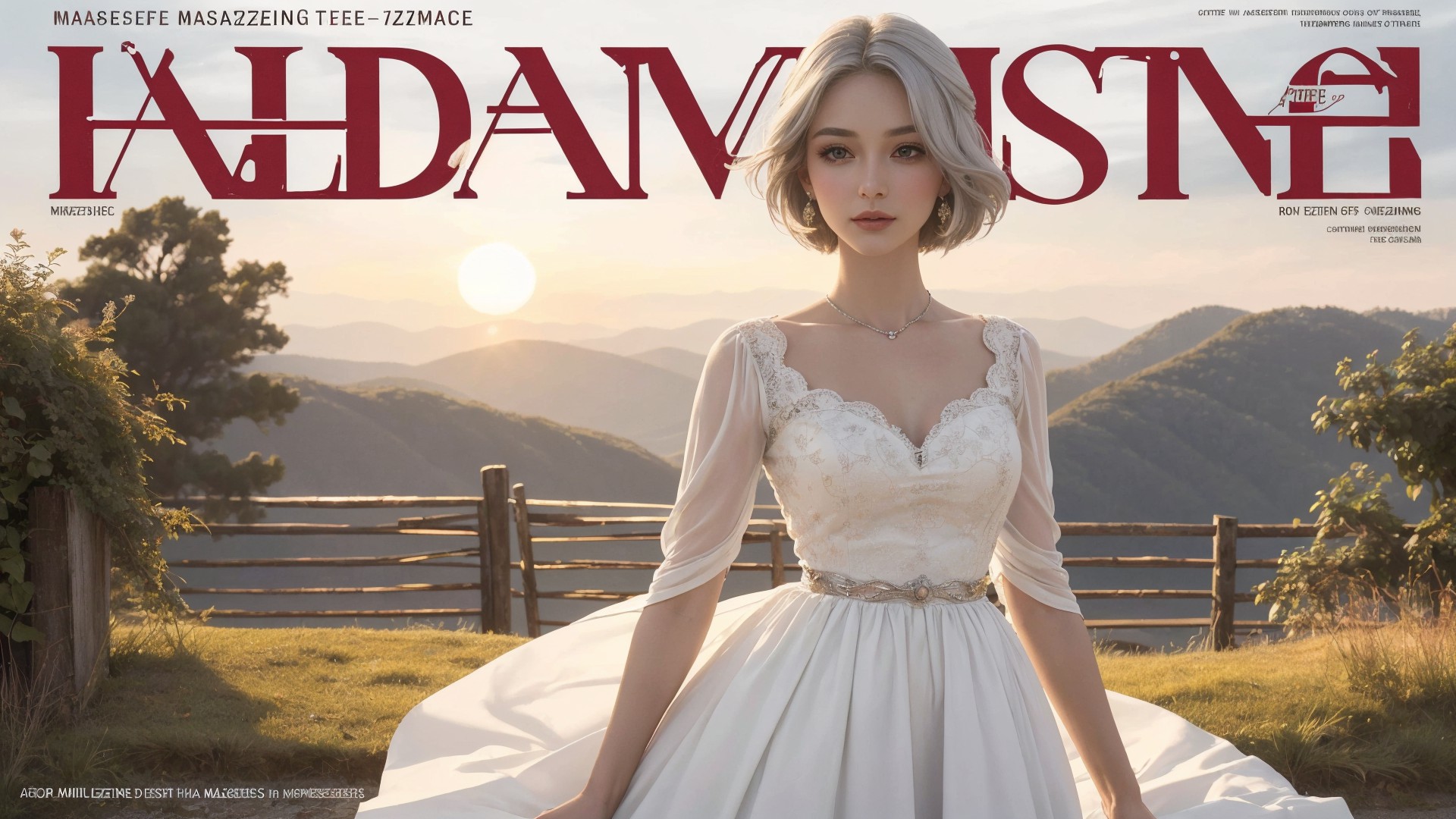 computer wallpaper,magazine cover photo of white haired beauty,real person,white dress with silver hair,cover shoot,detailed dress and face,magazine cover wearing stunning ivory dress,magazine cover,magazine cover art,stunning cover magazine, woman in wedding dress on magazine cover, cover magazine