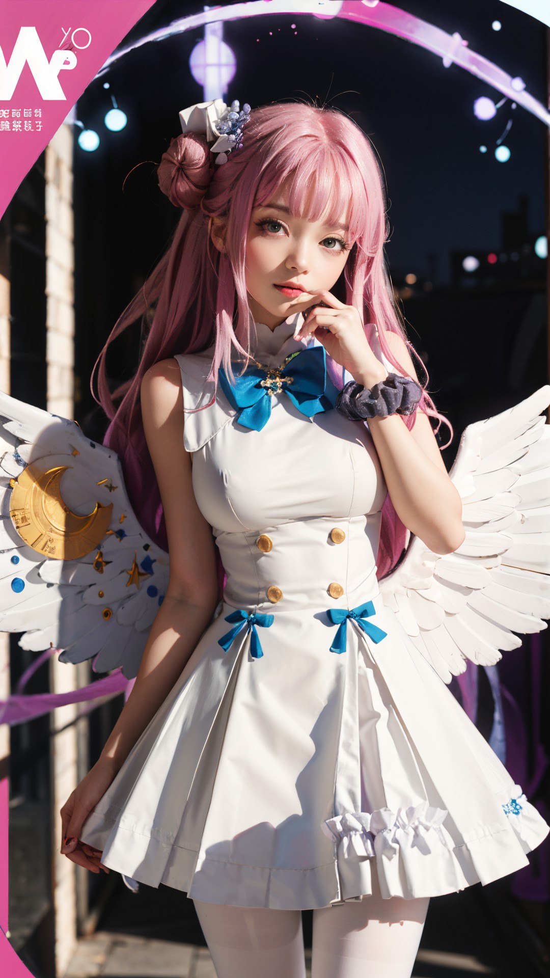 Mobile phone wallpaper, Misono Mika Blue Archive blue archive, realistic, gauze angel dress, anime cosplay, dressed angel, woman with pink hair in white dress, detailed wings, Cardcaptor Sakuras cherry blossoms, anime girl cosplay, an angel, antasy character, Ayaka cosplay, Madoka Madoka, symmetrical wings, skydoll noa, role play