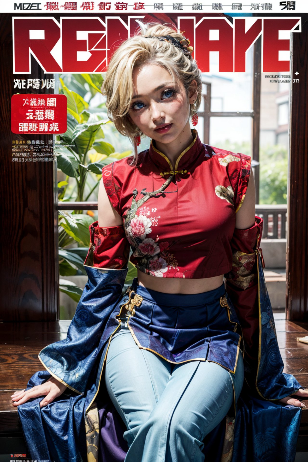 mobile phone wallpaper,Lucretia Meses,Suikoden,realism,ayami,magazine,charming and sexy geisha,cover magazine,a woman sitting on a bench on the magazine cover, wearing a red cheongsam,ayami koj ima,twen magazine,magazine spread,japanese model,torn magazine,wearing blue cheongsam,deayami Kojima,81 magazine
