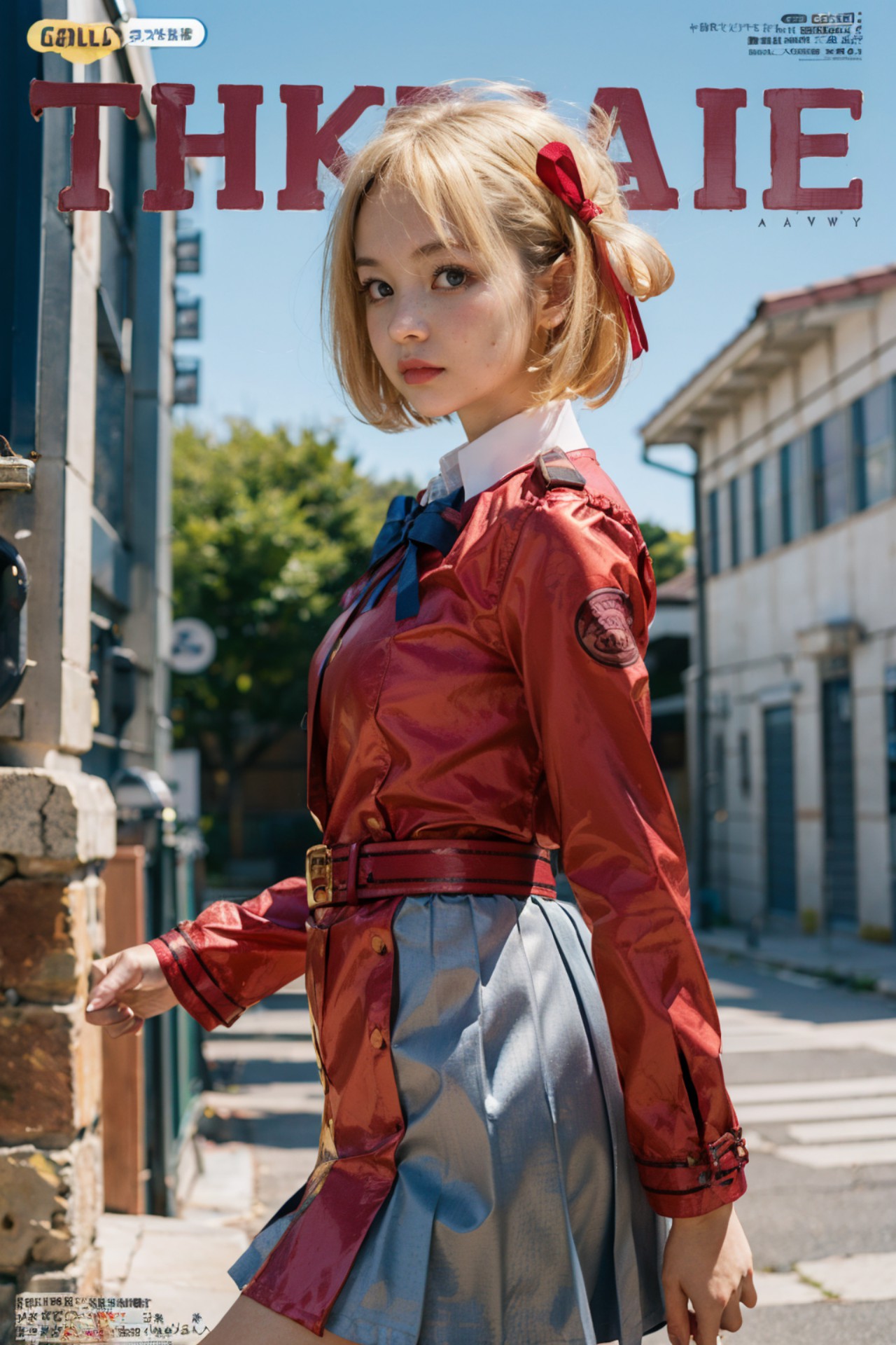 Mobile phone wallpaper, Nishikiki Chibeki, Lycoris Recoil, Realism, A woman in a red jacket and skirt posing for a magazine cover, Megumi Okada, Military Girl, The Last Exile anime, Wearing a jacket and skirt, Komatsuzaki Retro Futurism, Real Life The anime girl in , Seiko Shinkai, as a retro-futuristic heroine, Ayaka cosplays as the perfect robot girl