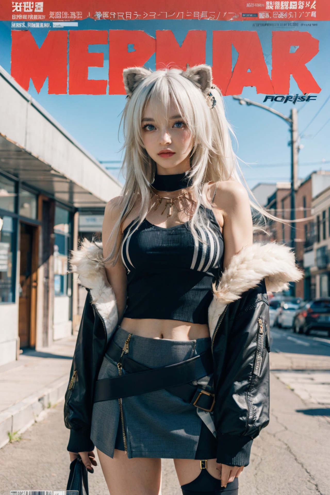 Mobile phone wallpaper, lion white peony, Hololive, realistic, Mechanic doll, cover magazine, heavy metal magazine cover, magazine cover, heavy metal magazine, girl with cat ears, milk bar magazine, cover shoot, girl with silver hair, magazine, heavy metal magazine cover, Magazine cover, anime girl with cat ears