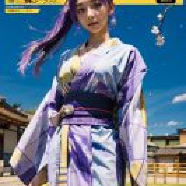 Mobile phone wallpaper,Shion,about me reincarnated as a slime,realistic,cover magazine,rena nounen style 3/4,magazine,magazine cover,outdoor magazine,yukata,purple long hair,ayami,cover shoot,magazine cover with A woman with purple hair, chin-length purple hair, photo magazine, magazine cover, long purple hair, wearing a colorful bathrobe
