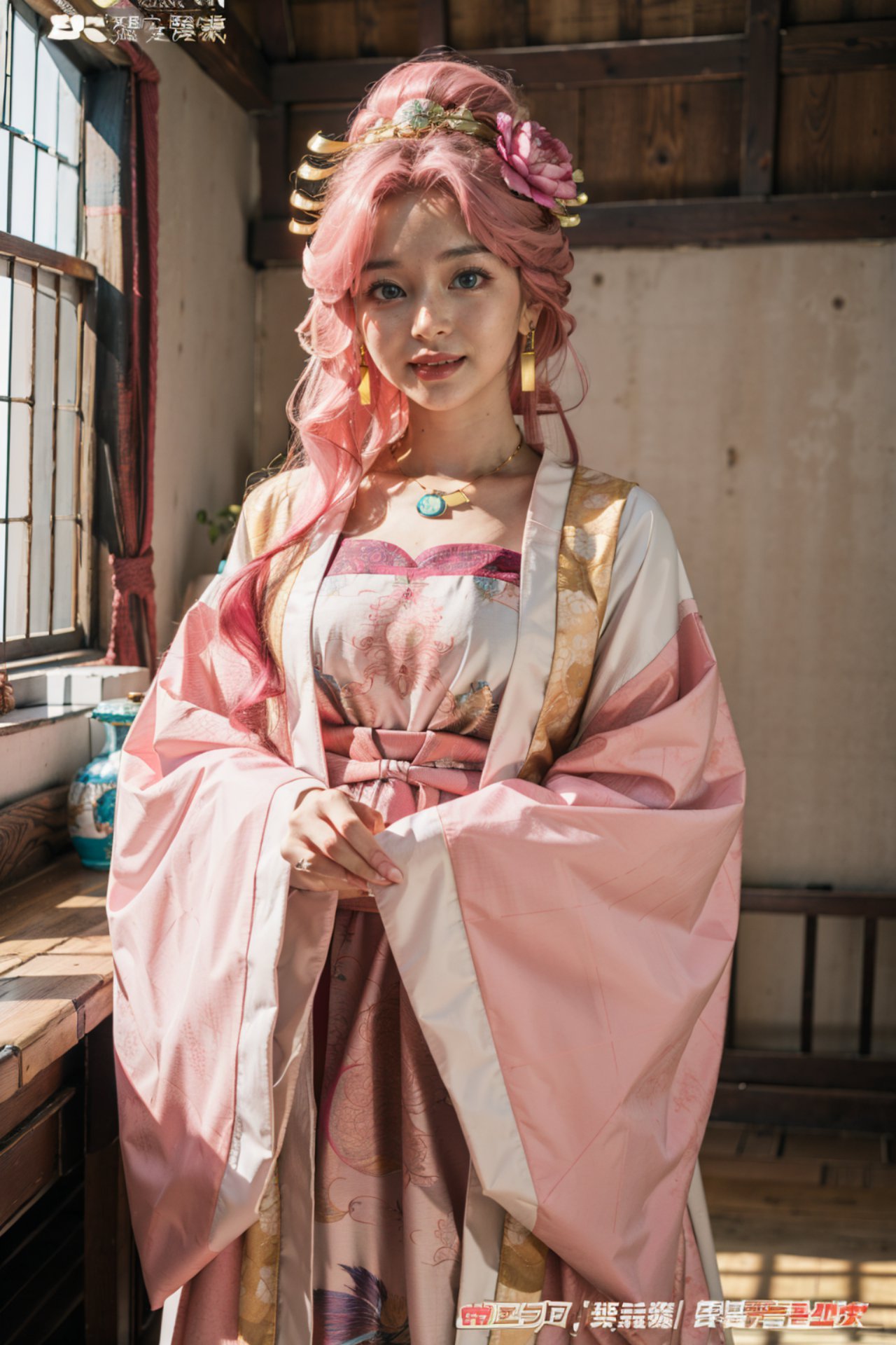 Mobile phone wallpaper, medicine house girls murmur, Gyokuyou, realistic, dress Female jade tailor, pink haired woman in kimono, ancient chinese costume, gorgeous flowing robe, beautiful dress