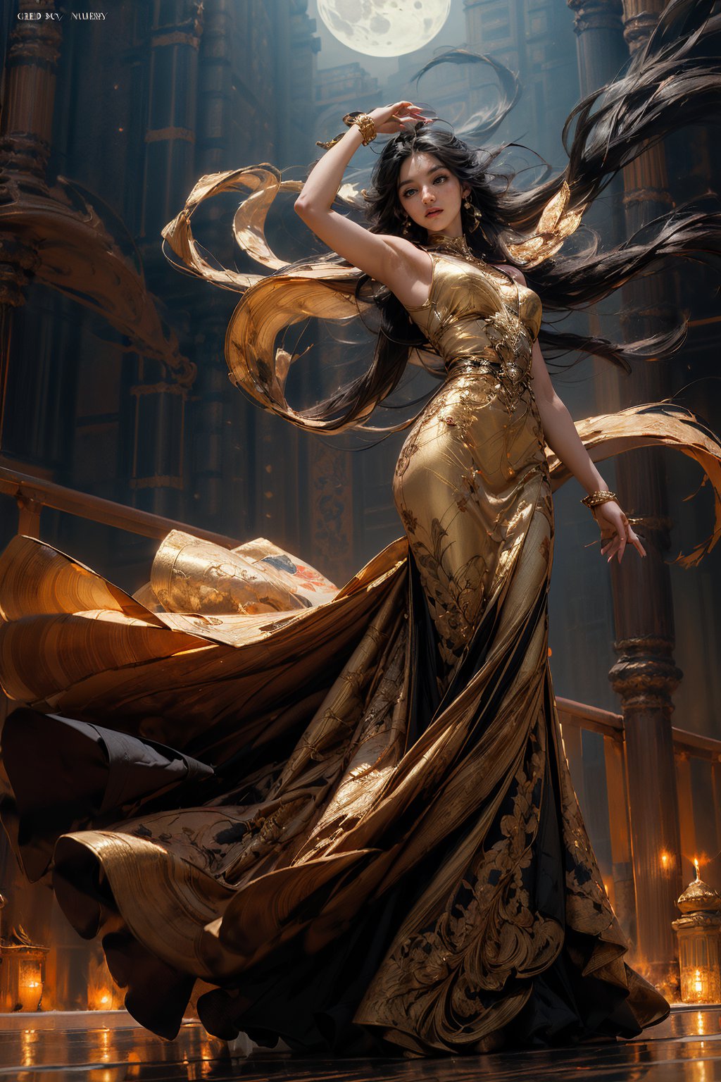 Mobile wallpaper,Dance Xuer-Dance,Realistic,In the photo, a woman stands on the stage, bathed in the soft light of orange candles. She wore a long gold and black dress, the colors contrasting beautifully against the dark background. The skirt fell behind her in a train, adding drama to her pose. She put one hand on her waist and the other hand elegantly on her head, showing a confident and elegant temperament. Her long black hair was flowing and matched the hem of her dress. The only source of light seemed to be the candles scattered around the stage, their warm glow illuminating the entire scene. The focus is entirely on the woman and her surroundings, depicting a moment frozen in time on this enchanting stage.