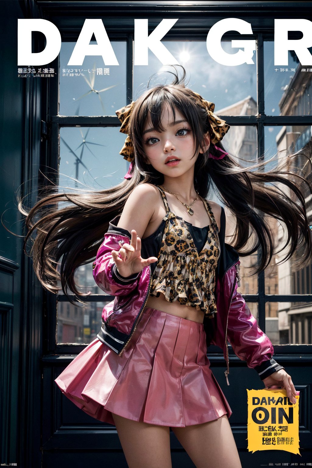 Mobile wallpaper, Risa Matoba, Cinderella Girls, Realistic, The protagonist in the photo is a young woman, she is the protagonist of the photo. She has long black hair and wears a golden headband on her head. Her outfit consisted of a pink jacket, a leopard print top and a black skirt. She posed with her right hand on her hip. The words DAK G and DAK ON IN also appear in the image, but their meaning or relationship to the women or the scene is not apparent from the image alone. The overall composition of the image suggests it could be promotional material for a fashion brand or artist. However, without additional context, it is difficult to determine the exact purpose or subject of the image.