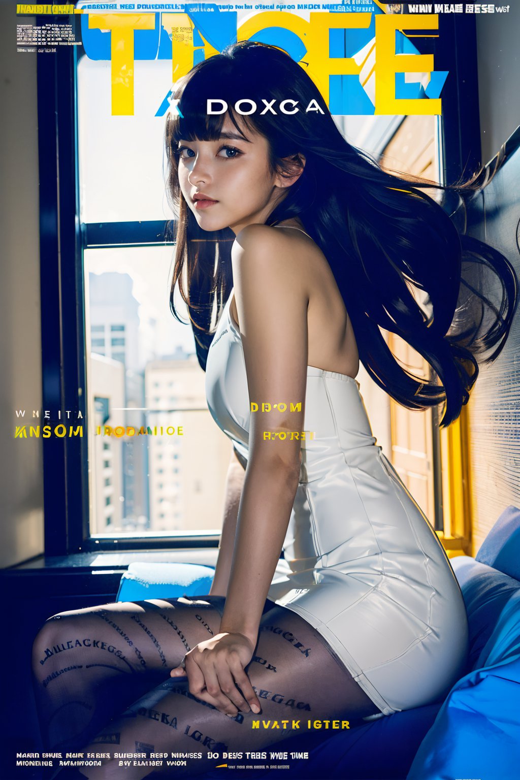 Mobile wallpaper, Balenciaga Stockings, Realistic, In the photo, a young woman is quietly thinking. She sat comfortably on a blue sofa, her legs elegantly crossed. Her outfit was chic and modern, including a white one-piece dress with black lace embellishments, paired with fishnet stockings. The windows were adorned with yellow curtains, allowing natural light to filter into the room, casting a soft glow on the woman. A plant in the background adds a touch of greenery and completes the overall ambience. The magazine in front of her had a dark-haired man on its cover, with the word Doxxy prominently displayed across the top, possibly the title or theme of the magazine.
