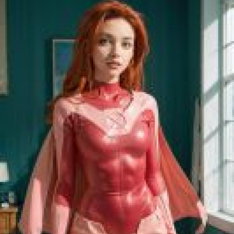 Mobile wallpaper,Samantha Eve Wilkins, Atom Eve,Realistic,In the center of the picture, a young woman with flaming red hair stands confidently. She wore a bright pink bodysuit with a distinctive X on her chest. The suit was paired with matching pink shorts and a long cape that flowed behind her, giving her an air of mystery. There were white curtains on the door, which, when slightly drawn, gave a glimpse of the interior. On either side of the door, two lamps cast a warm glow, adding depth and three-dimensionality to the scene. There is a painting hanging on the wall, its details a little blurred due to the distance, but still clearly visible. The precise positioning of objects and the contrast between them creates a visually appealing scene that grabs the viewer’s attention.