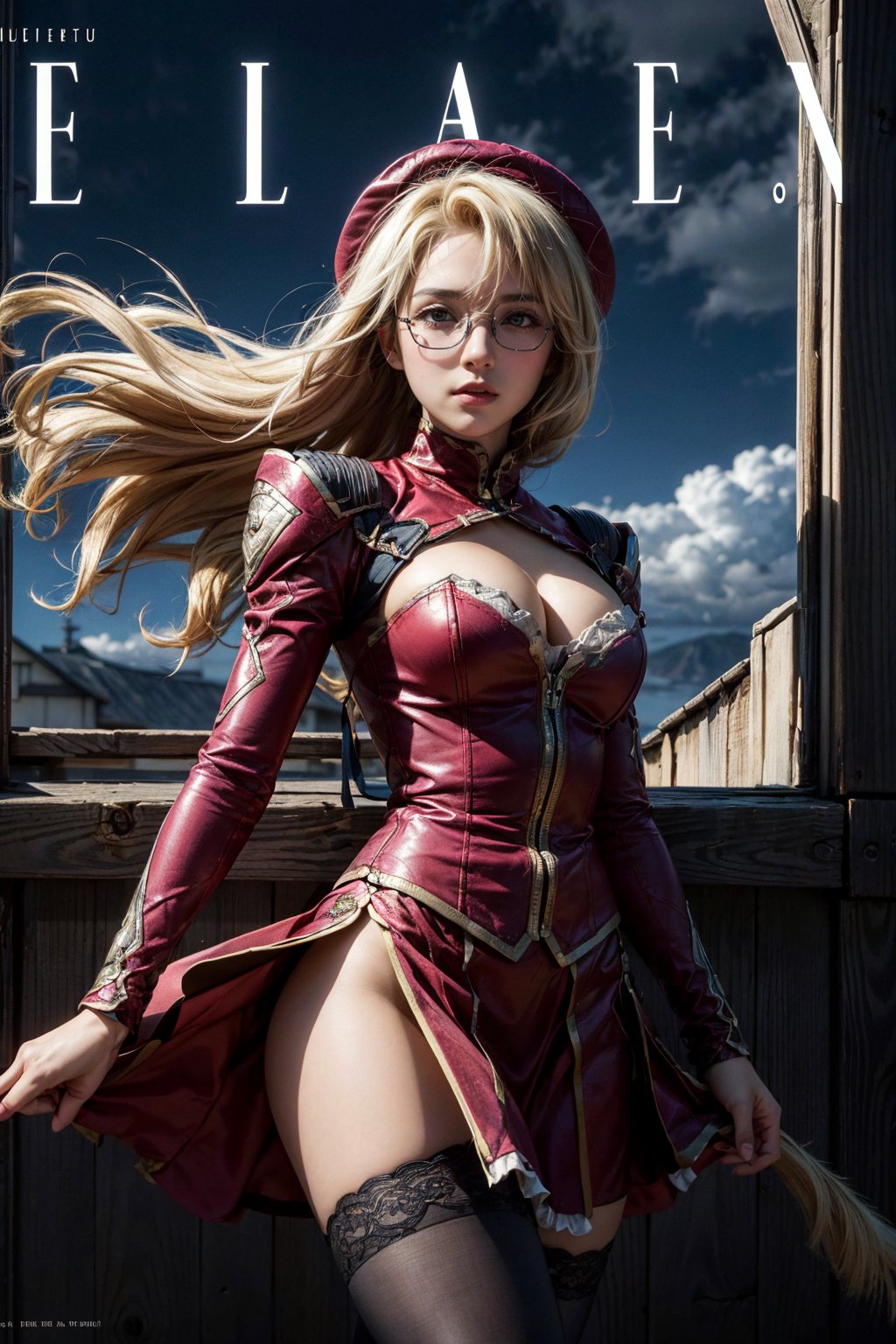 Mobile wallpaper, Satellizer el Bridget, realistic, the central figure in the painting is a young woman. She wore a bright red leather outfit, including a corset and skirt. The bodice featured gold embellishments, adding a touch of elegance to her outfit. She topped her head with a red hat adorned with feathers, adding a playful element to her outfit. A window can be seen from the right side of the building, suggesting it may have been a residential building. The precise positioning of the objects and the woman in the photo shows that the photographer was very careful in his composition. Overall, the photo captures a moment of a young woman wearing a striking red leather outfit with a wooden building in the background. The included text suggests this could be a professional photo shoot or promotion.