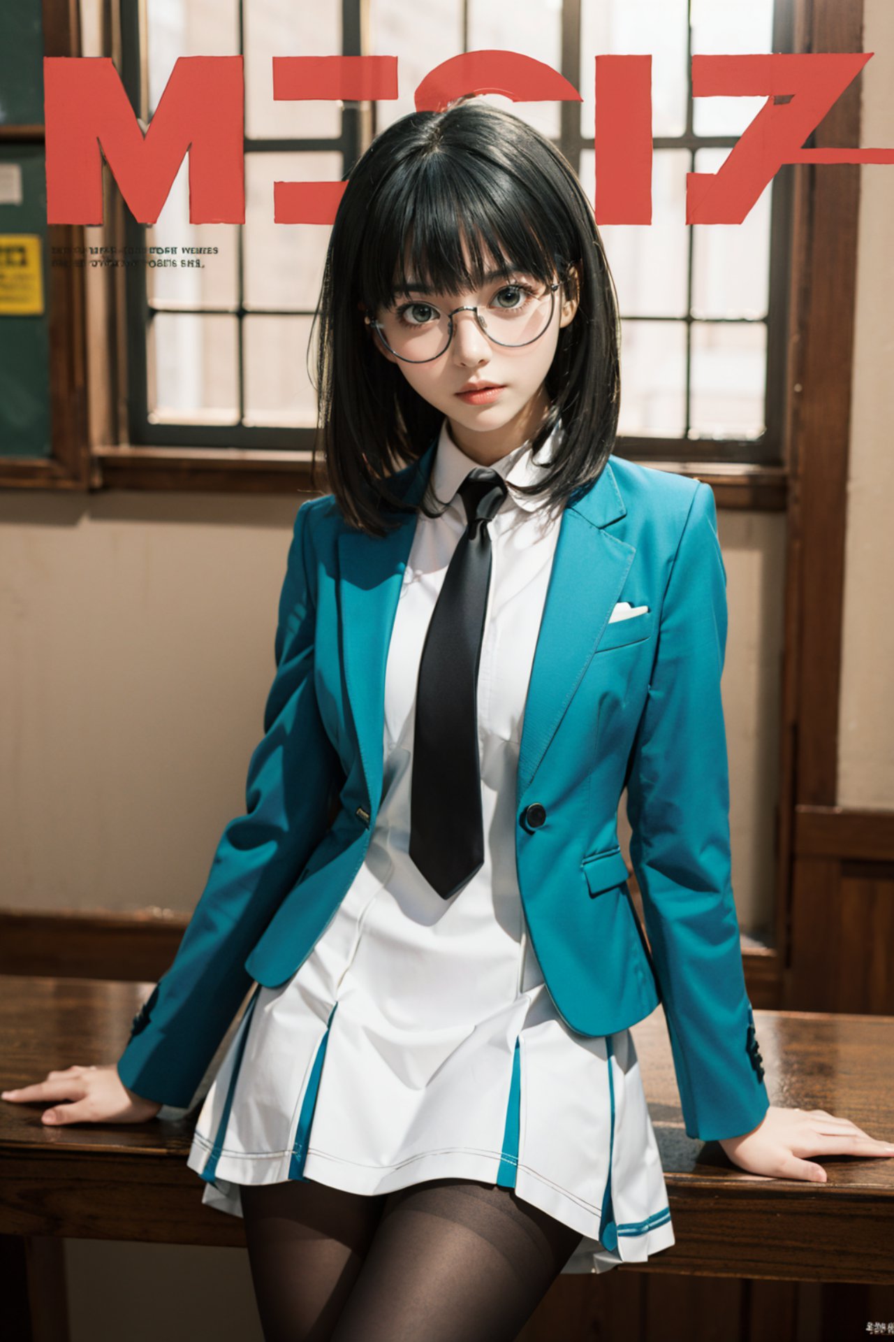 Shibata Mizuki (Shibata Mitsuki) An inferior student at a magic high school,In the center of the image, a young woman is seated at a wooden desk. Shes wearing a blue blazer with white accents, paired with a black tie and a white skirt. Her black hair is neatly styled, complementing her glasses. The desk shes sitting on is positioned against a window that offers a view of a building.The image also contains text. The word M is prominently displayed at the top left corner. On the right side of the image, in bold letters, the number 17 is written. This description provides a detailed account of the objects and their positions in the image, as well as any text present within it.