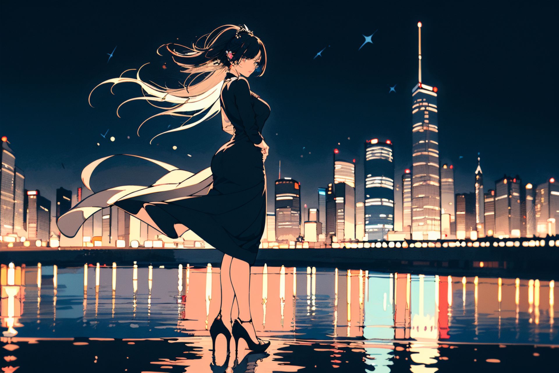 80s comic girl,In the image, a woman is captured in mid-stride on a bridge, her long hair flowing behind her. Shes dressed in a black dress and high heels, adding an air of elegance to her silhouette against the night sky. The city skyline forms a stunning backdrop, with its tall buildings illuminated by numerous lights that create a beautiful reflection in the water below. The woman appears to be alone on the bridge, and her direction suggests she is moving towards the right side of the image. Theres no text present in the image. The relative position of the objects indicates that the woman is closer to us than the city skyline, which is further away in the distance. The lights from the buildings are scattered across the background, adding depth to the scene. The overall composition of the image creates a sense of solitude and tranquility amidst urban life.