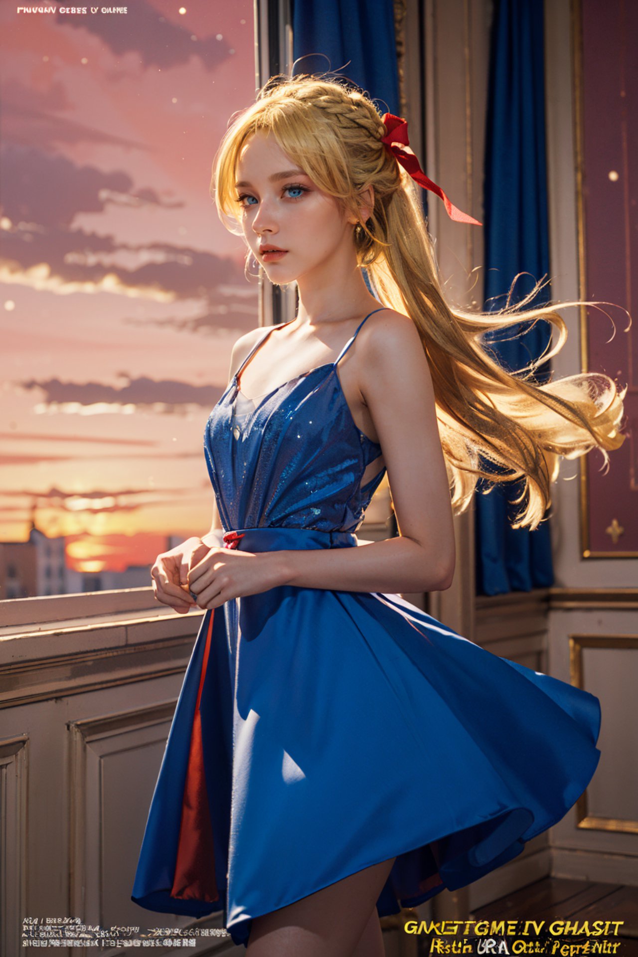 Spica Nerius Ragnarok Online,In the image, a young woman with blonde hair is the central figure. Shes standing on a balcony that features blue curtains and a gold railing. The woman is dressed in a vibrant blue dress adorned with red polka dots, which adds a playful touch to her appearance. A matching red headband sits atop her head, providing a pop of color against her blonde locks.The balcony offers a breathtaking view of a sunset, painting the sky in hues of orange and pink. The setting sun casts a warm glow over the scene, illuminating the woman and highlighting the details of her attire.At the bottom of the image, theres a text overlay that reads GAME TIME IN GASTIT, although its relevance to the overall composition is unclear from the image alone. The precise positioning of the objects and their relative locations contribute to a harmonious balance within the frame. The woman appears to be in motion, perhaps dancing or swaying with the rhythm of the wind, adding a dynamic element to this serene setting. Overall, the image captures a moment of joy and freedom, set against a backdrop of natural beauty. The womans vibrant attire contrasts beautifully with the warm tones of the sunset, creating a visually striking scene.