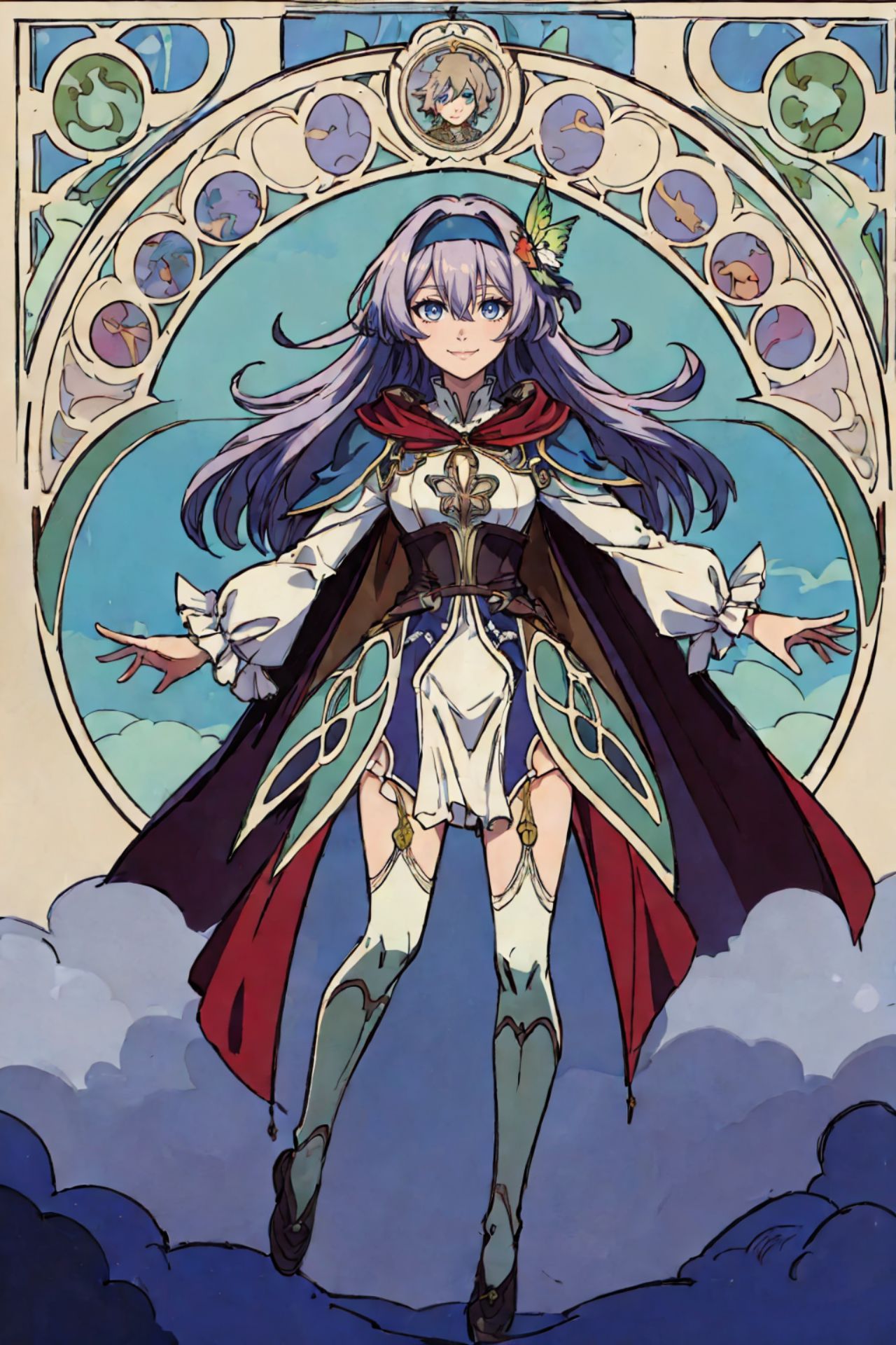Star Rail Firefly Trailblazer,In the center of the image, a young girl with blue hair stands confidently on a rock. She is dressed in a white and gold dress, adorned with a red cape that adds a touch of color to her attire. Her arms are extended outwards, as if embracing the world around her.The backdrop is a vibrant mural filled with colorful orbs and flowers, creating an atmosphere of joy and celebration. The girls position on the rock in the foreground gives a sense of scale and depth to the image, emphasizing the vastness of the mural behind her.There are no discernible texts or countable objects in the image. The relative positions of the objects suggest a harmonious balance between the figure and her surroundings, with the girl at the center drawing attention amidst the colorful chaos of the background. The image is rich in detail but devoid of any imaginary content, focusing solely on the tangible elements present within it.