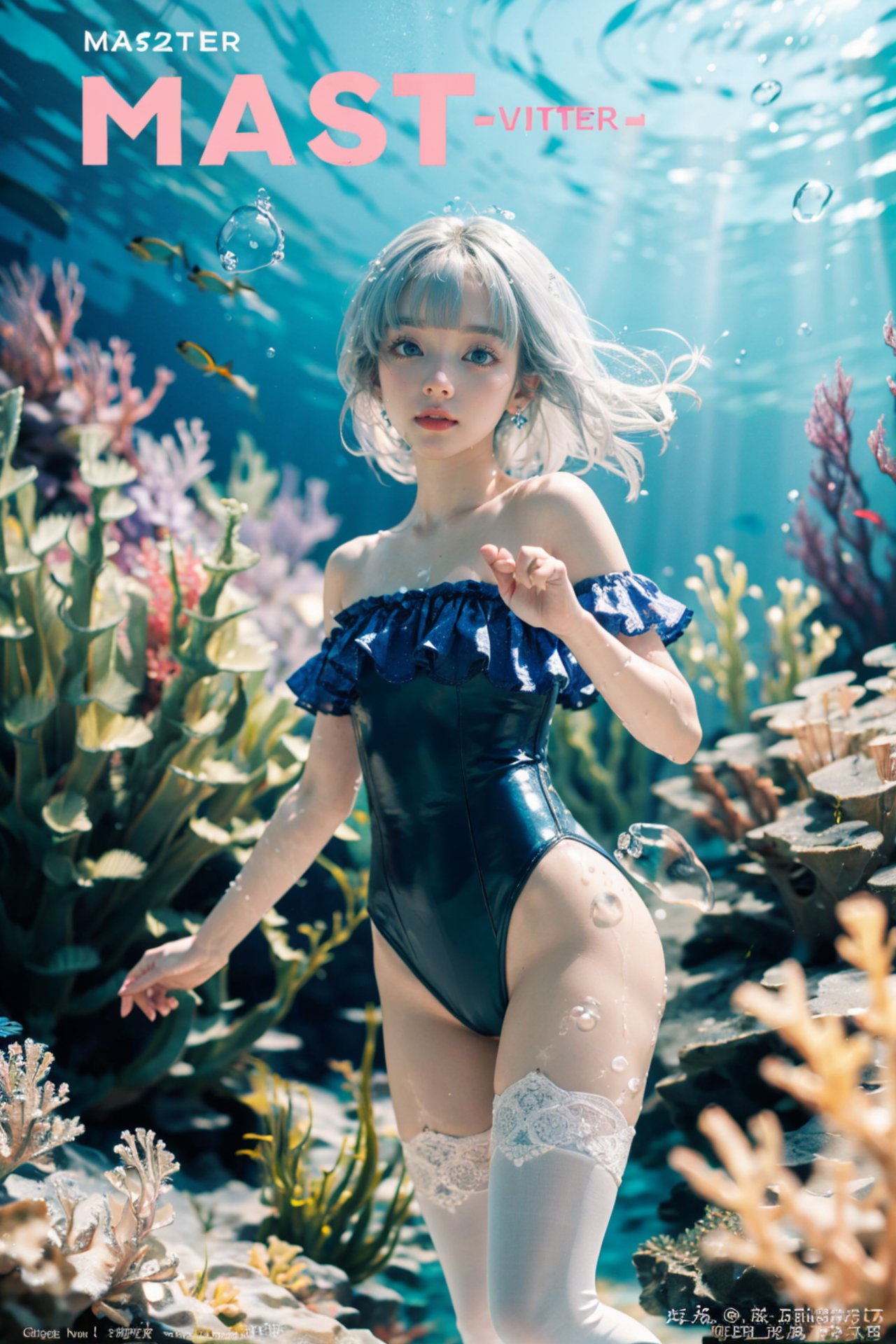 Mermaid,In the center of the image, a young woman with blonde hair is captured in mid-stride. Shes dressed in a vibrant blue swimsuit adorned with white polka dots. A pink ruffled collar adds a touch of whimsy to her outfit. Complementing her swimwear are white knee-high socks that shes wearing.Shes navigating through an undersea environment, evidenced by the water surrounding her and the coral reef in the background. The reef is a mix of purple and green hues, providing a stark contrast to the blue of the water.At the top right corner of the image, a pink banner stretches across, bearing the text MASTER WINTER and MASTER, possibly indicating the brand or event related to the image. The womans direction seems to be towards the right side of the image, suggesting movement within this underwater setting.