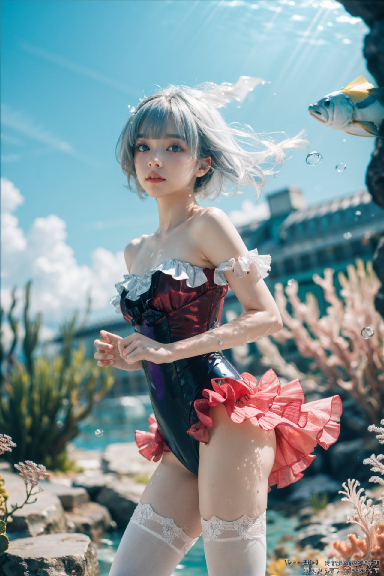 Mermaid,In the image, a young woman with gray hair is the central figure. Shes dressed in a black swimsuit adorned with pink flowers, and shes wearing white lace panties. Her stance is confident as she balances on one leg. To her right, a small blue fish swims in front of a rocky shore. The rocks are scattered haphazardly, adding a natural touch to the scene. The backdrop is a clear blue sky, providing a stark contrast to the vibrant colors of the womans attire and the fish. The image captures a moment of tranquility, with the woman and the fish seemingly at peace in their surroundings.