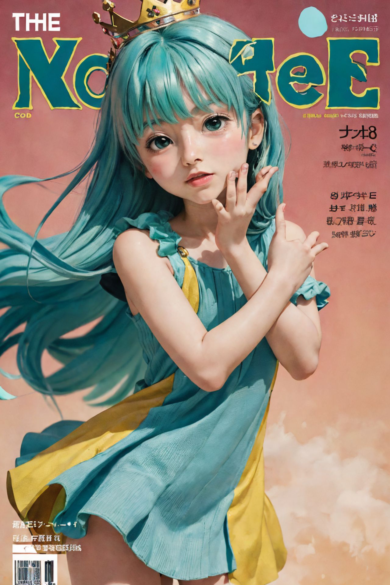 Sugar One Piece,The image is a vibrant cover of the September issue of Vogue magazine. Dominating the center of the image is a young girl with long blue hair and striking green eyes. Shes dressed in a blue dress adorned with a yellow bow at her waist, and she sports a gold crown on her head. Shes positioned against a backdrop that transitions from pink to orange, adding a warm hue to the overall composition. The magazine title, Vogue, is prominently displayed in bold red text, contrasting sharply with the background color.On the right side of the image, there are Japanese texts written in white and green colors. These texts are partially obscured by the girls left hand, which she holds up in a playful manner. In the bottom right corner of the image, theres a barcode, presumably for the magazine. The barcode is clearly visible against the colorful background.The overall layout of the image places the girl as the central focus, with all other elements serving to highlight her and draw attention to the magazine title.