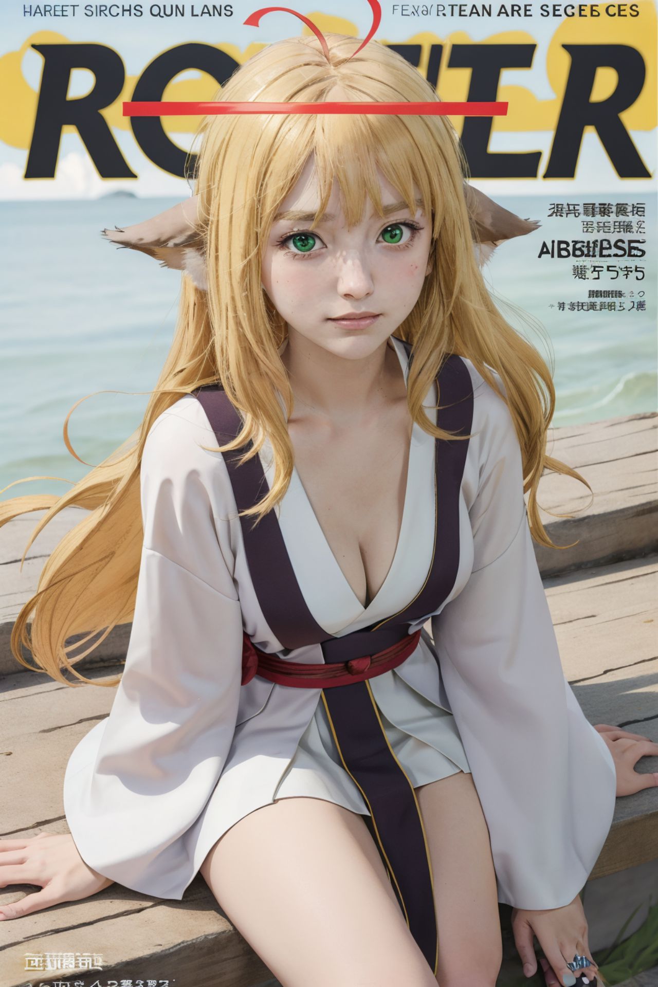 Susu Tushan 6,The image is a cover of the Hong Kong magazine ROISTER. The central figure is a young woman with golden blonde hair and striking green eyes. She has two horns protruding from her forehead, adding an element of fantasy to her appearance. Her attire consists of a white blouse adorned with blue stripes and a red sash, suggesting a cultural or traditional style.She is seated on a wooden bench, which provides a natural and rustic contrast to the vibrant colors of her outfit. The bench is positioned in such a way that it occupies a significant portion of the image, drawing attention not only to the woman but also to the serene setting around her.The background features a clear blue sky, suggesting an open outdoor location. A lush green tree can be seen behind the bench, further enhancing the natural ambiance of the scene.The magazines title ROISTER is prominently displayed in bold red and yellow letters at the top right corner of the image. This placement ensures that it captures attention while not detracting from the main subject of the cover - the woman with horns.Overall, the image presents a harmonious blend of natural elements and fantasy, creating an intriguing visual narrative on the magazine cover.