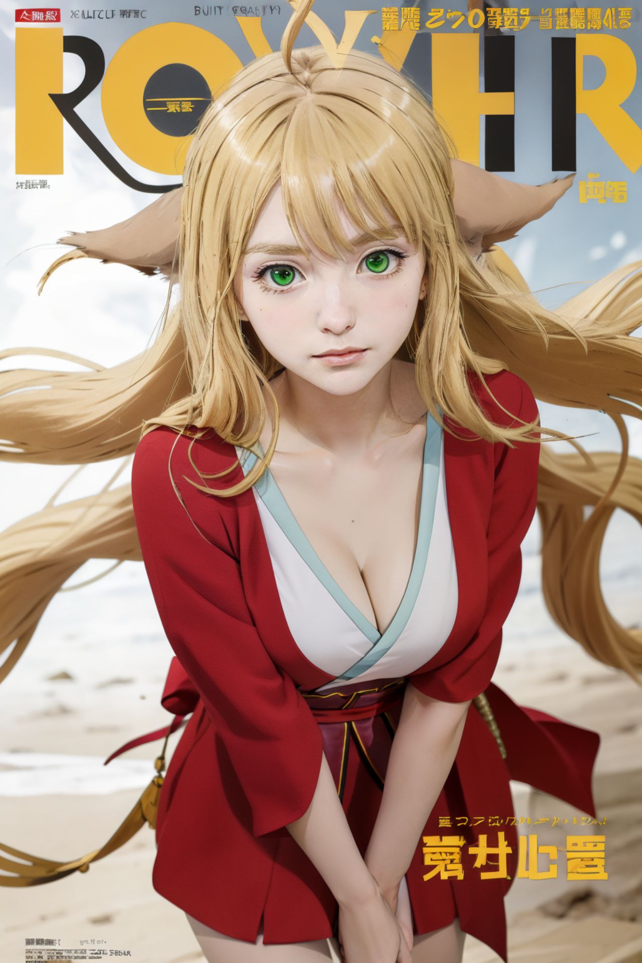 Susu Tushan 6,In the center of the image, a young girl with striking green eyes is captured. Her hair, as blonde as snow, contrasts beautifully with her fiery red dress and accessories. The dress, vibrant and eye-catching, is cinched at the waist with a red belt, accentuating her figure. She stands confidently against a backdrop that appears to be a beach or riverbank, adding an element of nature to the composition. The sandy texture under her feet suggests she might be on a beach. The image is dominated by bold colors - red from her dress and accessories, yellow from the text, and white from her hair and the background. These colors are vivid and draw the viewers attention.The word ROWHR is prominently displayed in large black letters at the top of the image, while a smaller font version of the same word can be seen in red letters beneath the girls chin, possibly indicating the magazine title or a signature.To her left, theres a text box filled with Japanese characters, suggesting that this might be an international magazine cover. The precise location of objects and their relative positions contribute to a balanced composition, making the image visually appealing. Overall, the image captures a moment frozen in time, telling a story without words through its visual elements.