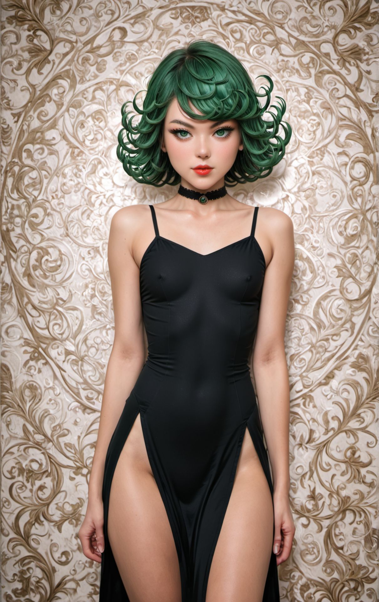 Tatsumaki,One Punch Man,In the center of the image, a young woman with vibrant green hair is the main subject. Shes wearing a black dress that features a plunging neckline and thin straps, adding an element of elegance to her appearance. Her hands are casually resting on her hips, a posture that suggests confidence.The woman is standing against a backdrop thats richly textured with gold. The pattern on the wall behind her adds depth to the image, creating a striking contrast between the subject and the background. Despite the complexity of the scene, theres no text present in the image. The relative position of the woman and the wall suggests shes standing quite close to it.Overall, the image captures a moment of stillness with the young woman as its focal point, set against a backdrop thats both textured and patterned. The absence of other objects or individuals in the frame further emphasizes her presence in the image.