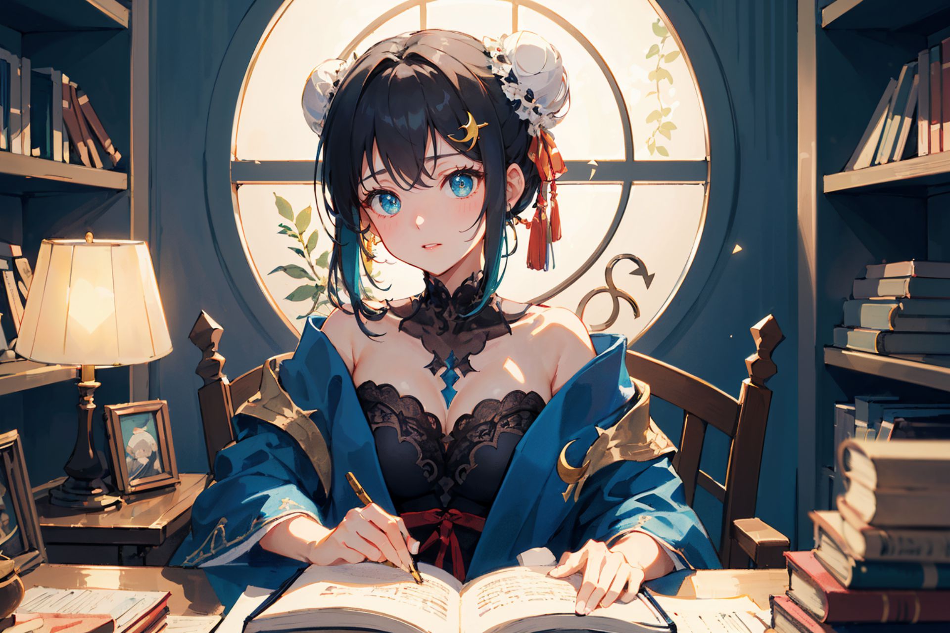 Library Girl,In the image, a young girl is engrossed in her work at a desk. Shes dressed in a blue dress adorned with gold trimmings, and she wears a white headband embellished with a single red flower. The girl is seated on a wooden chair, her attention focused on the open book before her.The room around her speaks of an intellectual pursuit. Shelves filled with books form a backdrop to the scene, suggesting that this could be a study or a library. A window punctuates one wall of the room, its view obscured by curtains. The entire setting is bathed in soft light filtering through the window, casting a warm glow on the girl and her surroundings.The image captures a moment of quiet concentration and learning, as if frozen in time. The girls posture and the open book indicate shes deeply engaged in reading or perhaps writing. The room around her, filled with books and bathed in soft light, further emphasizes the atmosphere of studious pursuit. Its a snapshot of a young mind at work, surrounded by knowledge and illuminated by learning.