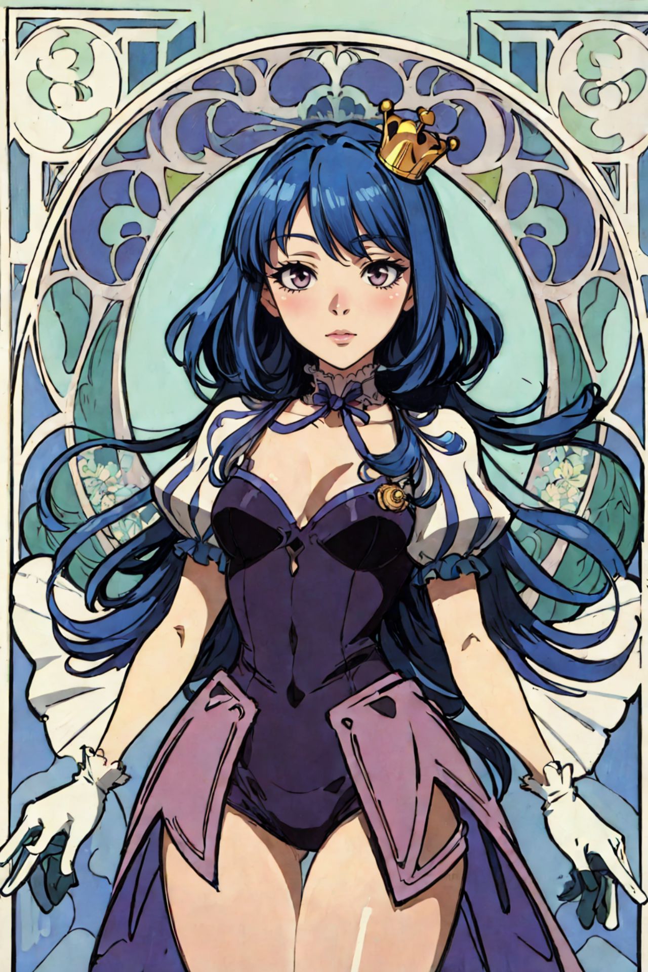 THE iDOL MSTER,In the image, theres a young woman who is the central figure. She has long blue hair that cascades down her shoulders, and shes wearing a crown on her head, signifying perhaps a royal or noble status. Her outfit consists of a purple dress adorned with gold accents, which adds a touch of elegance to her appearance.She stands in front of a stained glass window, its intricate design visible behind her, adding depth to the scene. The window is part of a larger structure that resembles a castle, further emphasizing her royal status.The womans gaze is directed off to the side, and she has a serious expression on her face, suggesting deep thought or contemplation. The overall image gives an impression of a royal figure in a moment of introspection within a medieval setting.