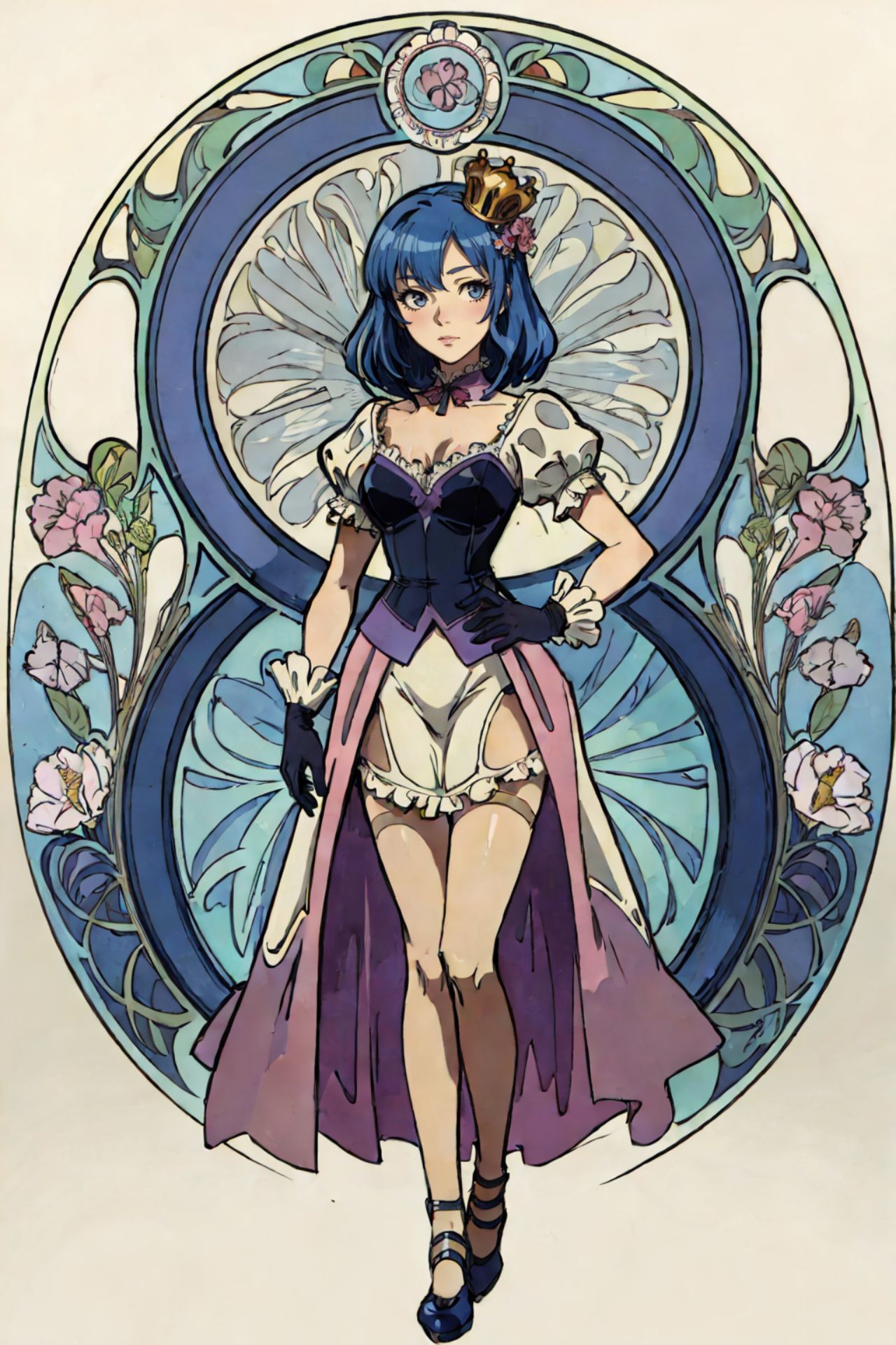 THE iDOL MSTER,The image portrays a young woman exuding an aura of elegance and grace. She is adorned in a striking blue dress that contrasts beautifully with her hair, which is styled in loose curls cascading down her shoulders. A gold crown rests on her head, adding to her regal appearance.She stands assertively within a blue archway, her left hand confidently resting on her hip while her right hand delicately holds the skirt of her dress. The archway itself is a work of art, intricately detailed with floral patterns and a border that mirrors the same blue hue as the womans dress and the archway.The background of the image provides a serene setting for this scene. It features a light blue color that subtly complements the elements within the image. A white lattice pattern adds depth to the background, while pink flowers interspersed throughout add a touch of natures beauty.Every element in this image, from the womans attire to her pose and the surrounding architecture, comes together to create a scene that is both visually appealing and rich in detail.