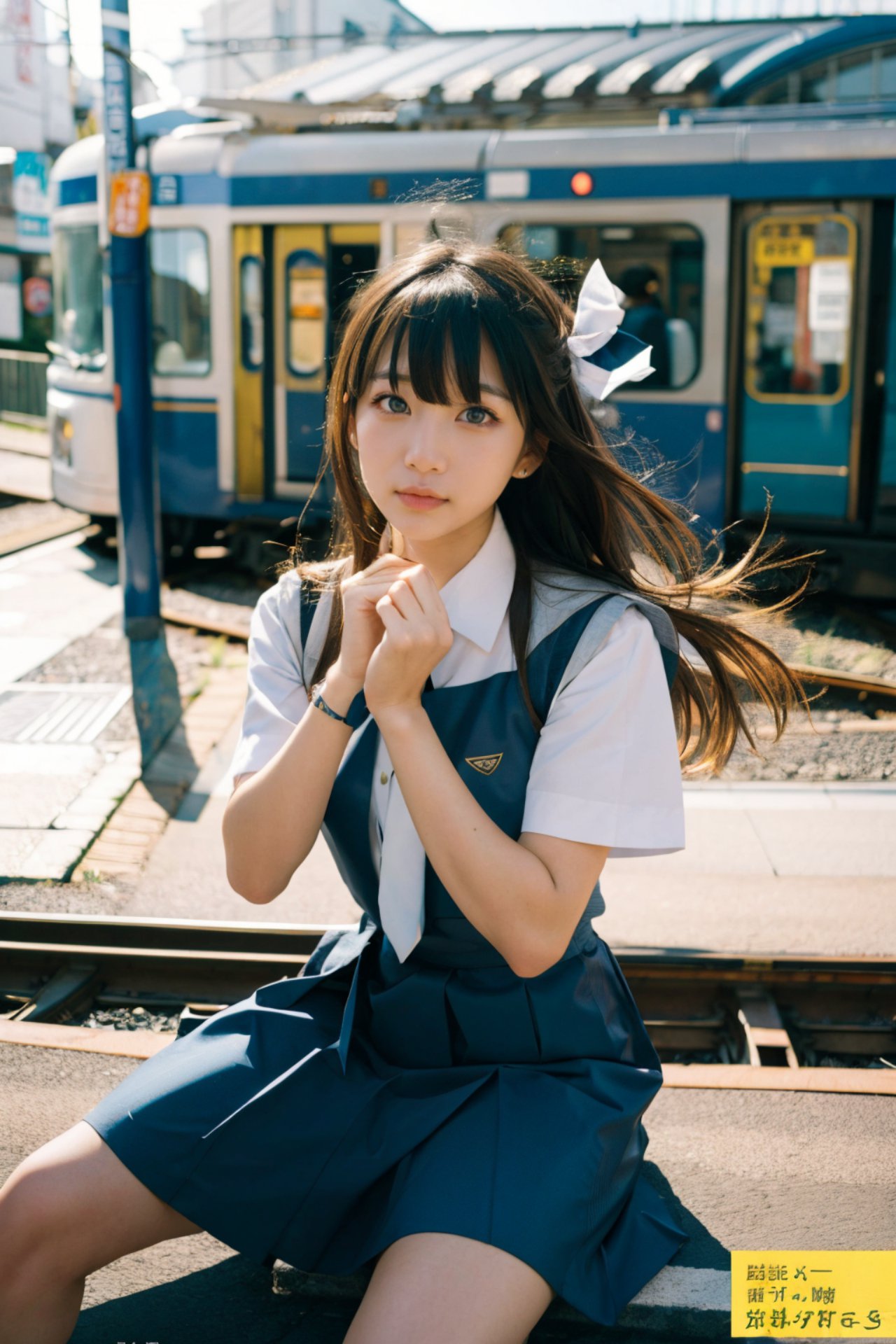 Tokyo Girl,In the image, a young girl is the main subject. Shes sitting on a bench with her legs crossed. Her attire consists of a blue skirt and a white blouse. A yellow name tag adorns her blouse, bearing the name 蝢?. Behind her, a train station unfolds. A blue and white train is captured in motion, passing by on the tracks. The station itself features a roof, under which various signs are displayed. Among these signs, a prominent one stands out with the text 憭折撣葉憭桀, indicating the location as Osaka City, Chuo Ward.The image captures a moment of everyday life at a train station, with the young girl adding a touch of innocence to the scene. The colors in the image - the blue and white of the train, the green of the sign, and the blue skirt of the girl - create a vibrant yet harmonious composition. This description is based on the visible elements in the image and does not include any speculative or imaginary content.