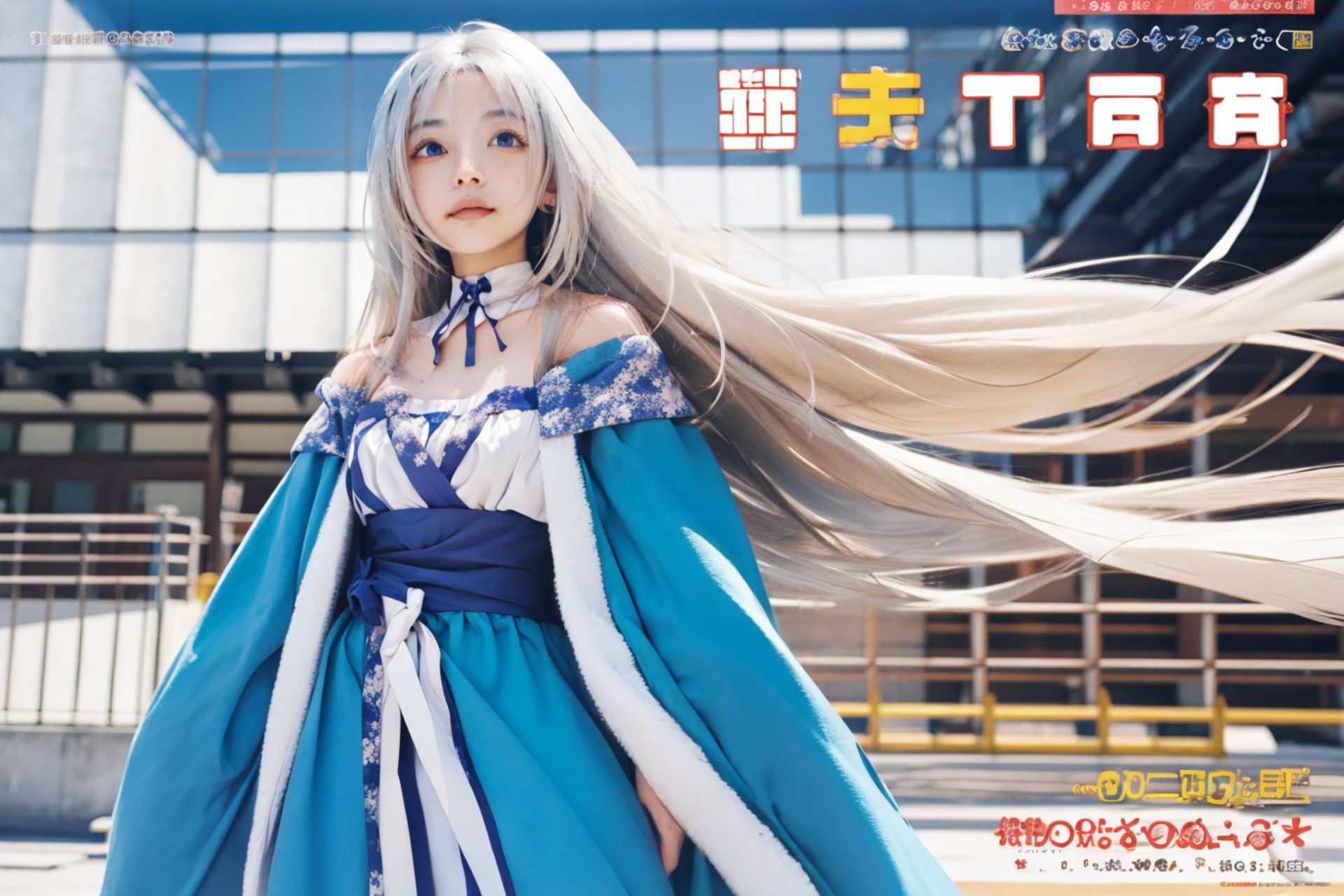 Tomotake Yoshino aliceglint,a girl in blue dress with white hair standing next to a building.