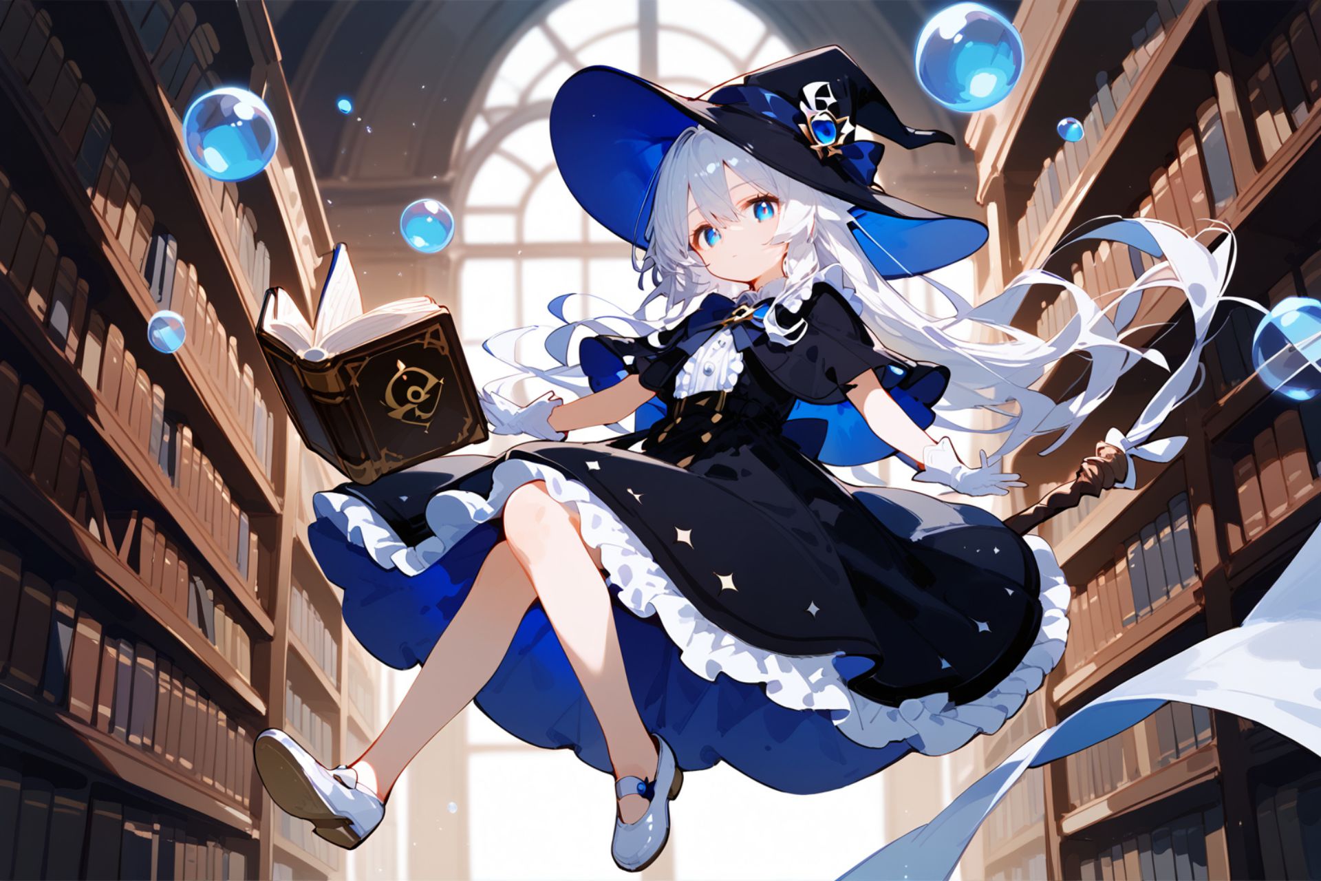 Naughty Magic Girl,In the center of a library filled with shelves of books, stands a young witch named Elise. She is dressed in a black outfit that contrasts sharply with her white hair and blue hat. In her right hand, she holds a book, while in her left, a wand. Above her head, blue bubbles float, adding an element of magic to the scene. The witchs gaze is directed upwards, towards the camera, giving us a clear view of her determined expression. Despite the fantastical elements, theres a sense of calm and order that pervades the image, perhaps indicative of Elises role as a guardian of knowledge within this library. There are no discernible texts in the image. The relative positions of the objects suggest a well-organized space, with books neatly arranged on the shelves and Elise standing firmly in the center. The image does not contain any other countable objects or actions.