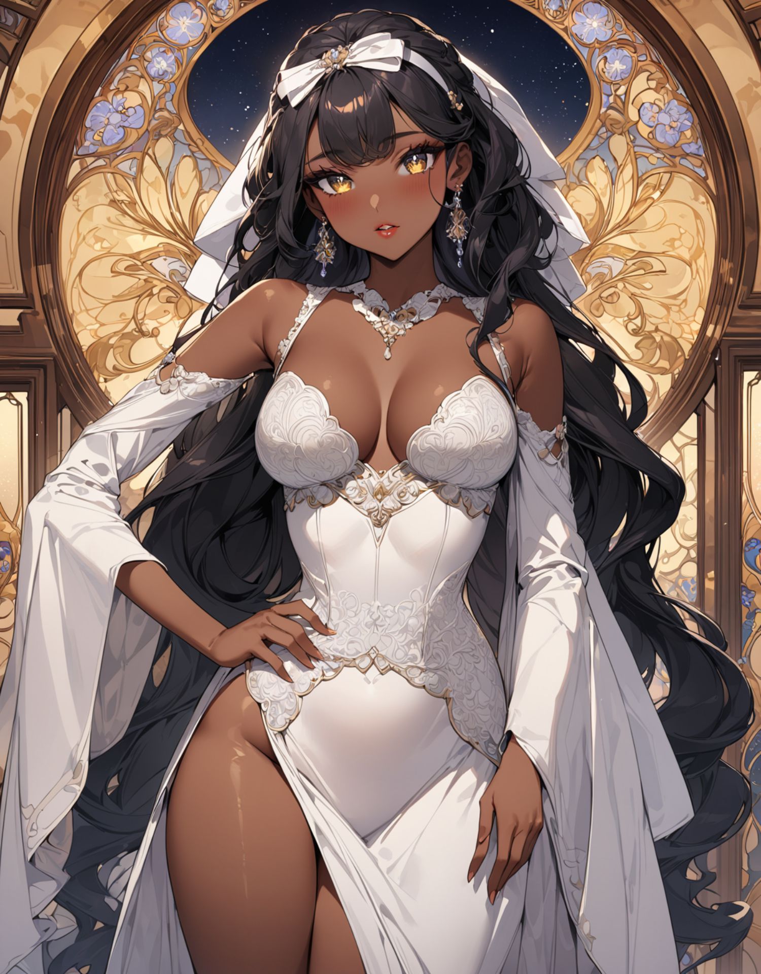 Sexy Bride,The image portrays a young woman adorned in a white wedding dress with gold accents. The dress is intricately designed, featuring a beaded bodice and lace panels that add to its elegance. Her hair is styled in loose waves that fall gracefully around her shoulders. She is wearing large earrings and a headpiece, which are noticeable features of the image.The woman is standing in front of a stained glass window, through which a blue sky can be seen, creating a serene backdrop for the scene. The stained glass window appears to be part of a larger structure, as there are other stained glass windows visible behind her.There is no text present in the image, and the relative positions of the objects are such that the woman is in the foreground with the stained glass windows in the background. The focus of the image is clearly on the woman, with the background serving to enhance the overall composition. The image does not contain any other discernible objects or actions. The colors, object types, and their precise locations have been described as accurately as possible based on the available information.
